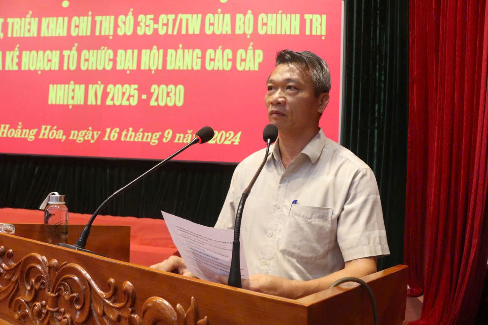 Ông Lê Xuân Thu, Bí thư Huyện ủy Hoằng Hóa nhấn mạnh: Để tổ chức thành công đại hội Đảng bộ, chi bộ cơ sở và Đại hội Đảng bộ huyện lần thứ XXVIII, nhiệm kỳ 2025 - 2030, công tác chuẩn bị và tổ chức đại hội phải được các cấp ủy lãnh đạo, chỉ đạo thực hiện theo đúng quy định và nguyên tắc của Đảng. Ngay sau hội nghị, cấp ủy, tổ chức Đảng trực thuộc bám sát Chỉ thị số 35-CT/TW của Bộ Chính trị và các văn bản, quy định, hướng dẫn của Trung ương, của Tỉnh ủy, Ban Thường vụ Huyện ủy về tổ chức Đảng các cấp nhiệm kỳ 2025-2030 để xây dựng và hoàn thiện kế hoạch của cấp mình. Tổ chức quán triệt, triển khai thực hiện ở cấp mình đến toàn thể cán bộ, đảng viên; đồng thời, tiến hành thành lập các tiểu ban.