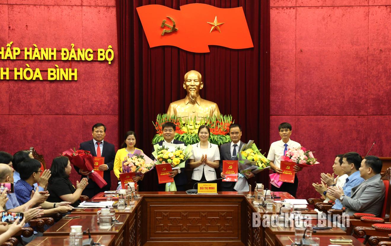 Bà Bùi Thị Minh, Phó Bí thư Thường trực Tỉnh ủy, Chủ tịch HĐND tỉnh, Trưởng Ban Tổ chức Tỉnh ủy trao quyết định bổ nhiệm cho Ban Biên tập Báo Hòa Bình. Ảnh: LC