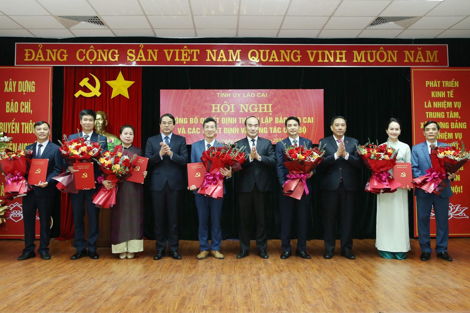Lãnh đạo tỉnh Lào Cai tặng hoa chúc mừng các cán bộ được bổ nhiệm vào Ban biên tập Báo Lào Cai sau hợp nhất. Ảnh: ND