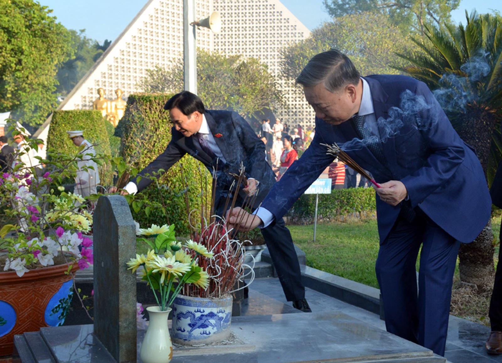 Đại tướng Tô Lâm, Ủy viên Bộ Chính trị, Bộ trưởng Bộ Công an dâng hương tại Nghĩa trang Liệt sĩ A1 cùng đoàn đại biểu dự Đại hội (Ảnh: http://baodienbienphu.info.vn/)