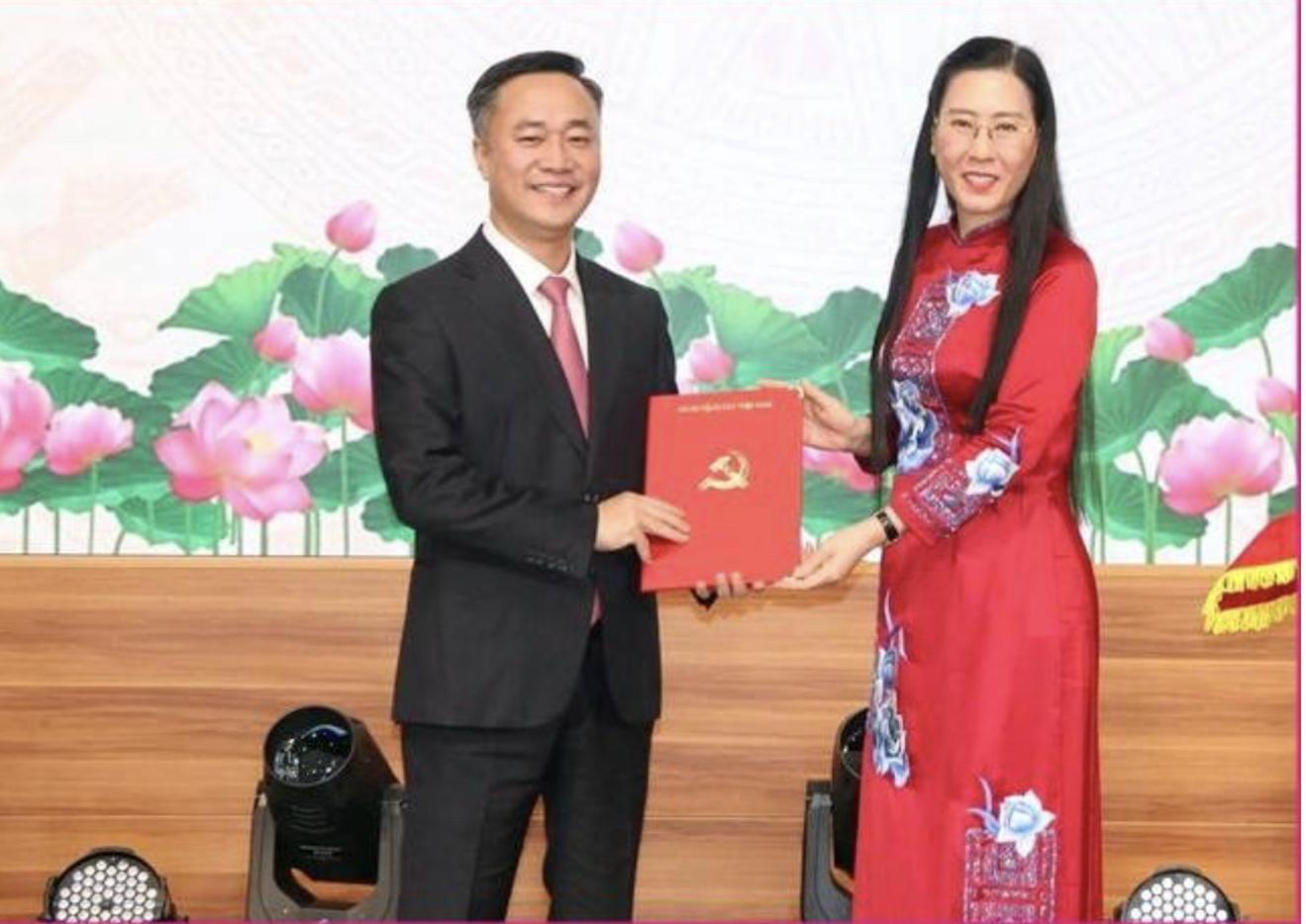 Bà Bùi Thị Tường Vân, Phó trưởng Ban tổ chức Trung ương trao quyết định điều động, chỉ định giữ chức Phó Bí thư Tỉnh uỷ Khánh Hoà cho ông Nguyễn Việt Hùng. Ảnh HL