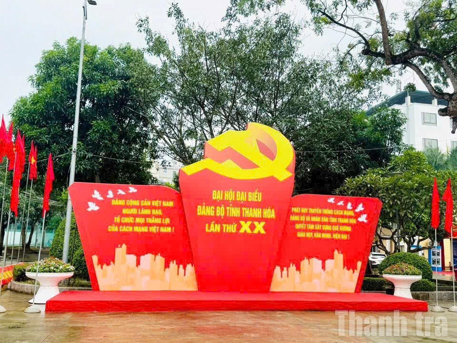 Trang trí và khẩu hiệu được các phường ở Thanh Hóa thực hiện rất công phu để đón chào Đại hội Đảng bộ tỉnh lần thứ XX. Ảnh: Văn Thanh