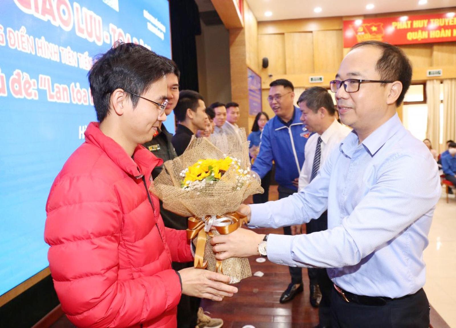 Tổng Biên tập Báo Tuổi trẻ Thủ đô Nguyễn Mạnh Hưng tặng hoa đến các gương mặt tiên tiến tham gia giao lưu tại chương trình
