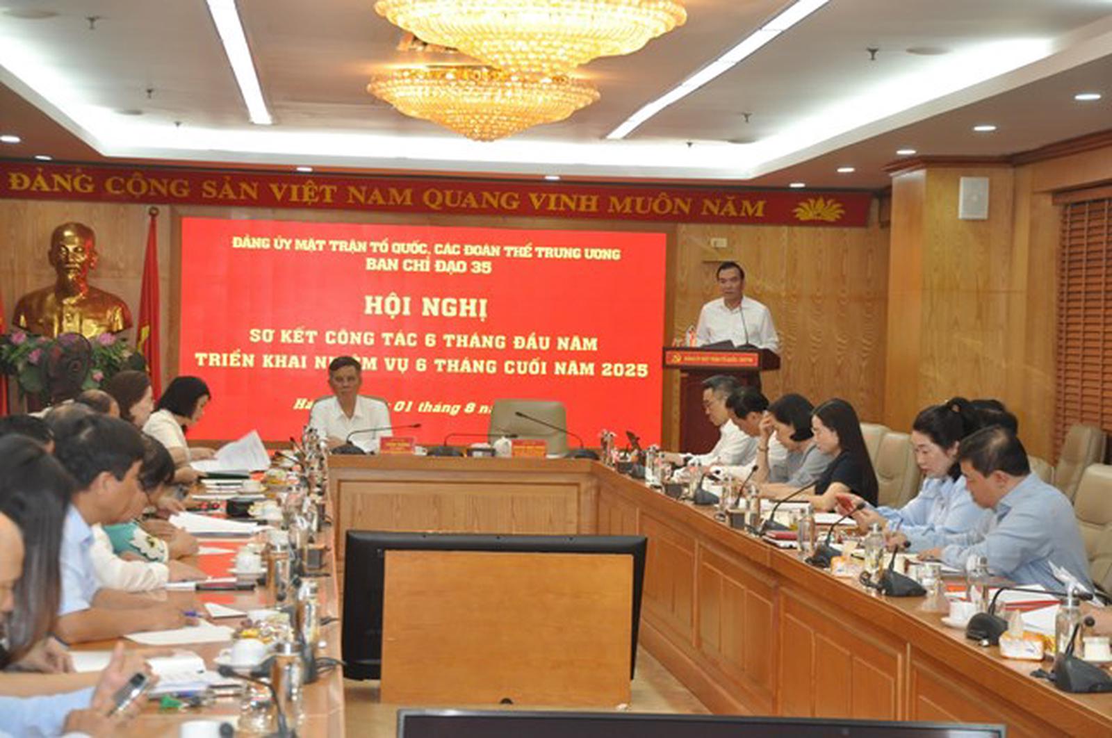 (Thanh tra) - Sáng 1/8, Ban Chỉ đạo 35 Đảng ủy Mặt trận Tổ quốc và các đoàn thể Trung ương tổ chức Hội nghị sơ kết công tác 6 tháng đầu năm, triển khai nhiệm vụ 6 tháng cuối năm 2025 về bảo vệ nền tảng tư tưởng của Đảng. Đồng chí Trần Thắng, Phó Bí thư Đảng ủy, Trưởng ban Chỉ đạo 35 và đồng chí Nguyễn Minh Chung, Ủy viên Ban Thường vụ, Trưởng ban Tuyên giáo và Dân vận, Phó Trưởng ban Chỉ đạo 35 chủ trì hội nghị.