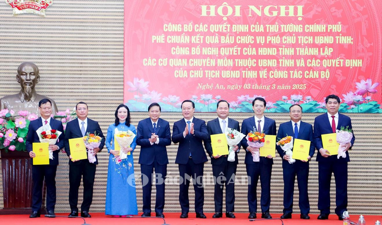 Lãnh đạo tỉnh Nghệ An trao quyết định bổ nhiệm cho các sở, ngành. Ảnh: Phạm Bằng