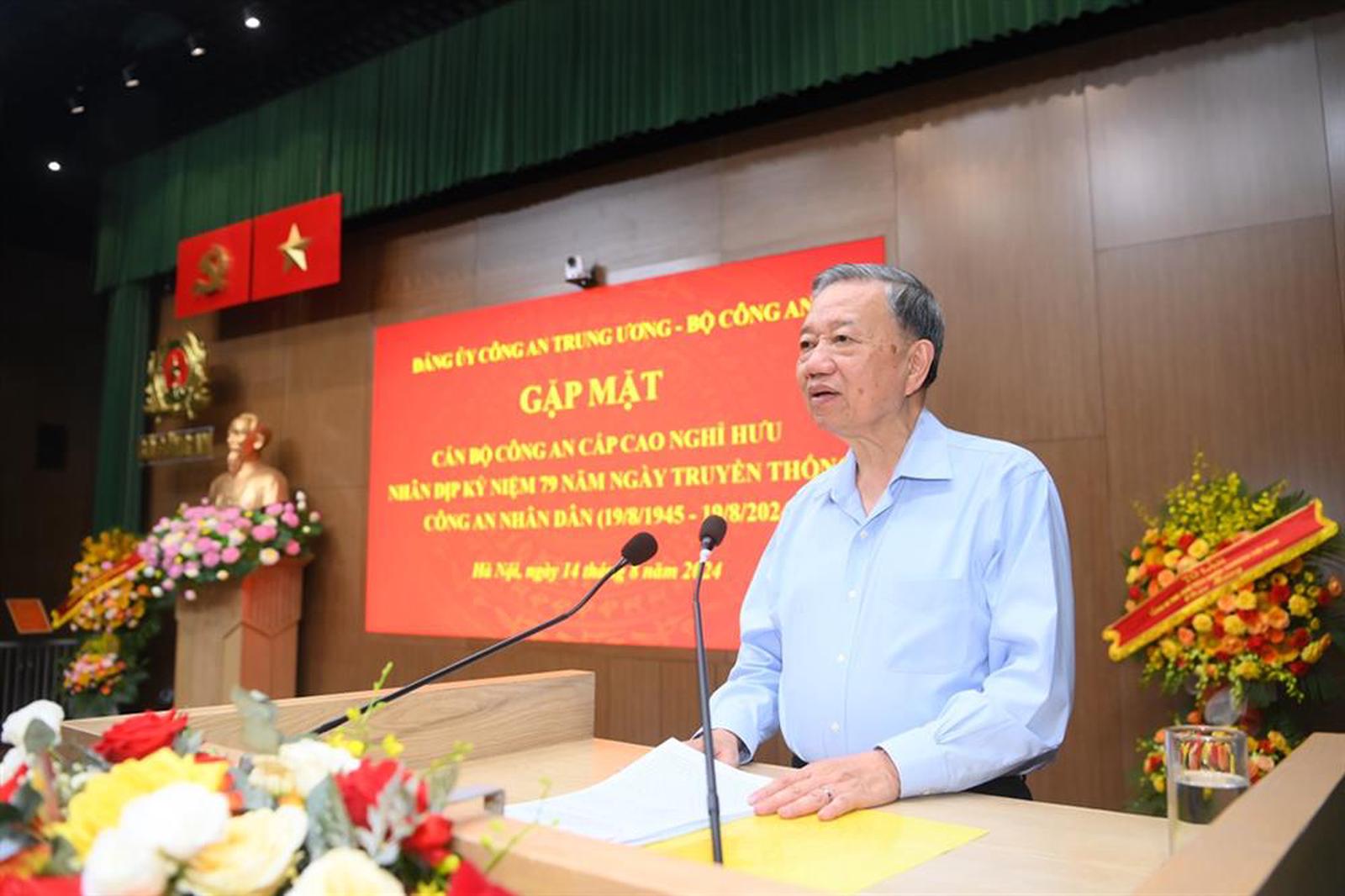 Đến dự và phát biểu tại buổi gặp mặt, Tổng Bí thư, Chủ tịch nước Tô Lâm gửi đến các đại biểu lời thăm hỏi chân tình và lời chúc mừng tốt đẹp nhất; chúc mừng những chiến công, thành tích mà toàn lực lượng CAND đã đạt được trong suốt 79 năm qua.