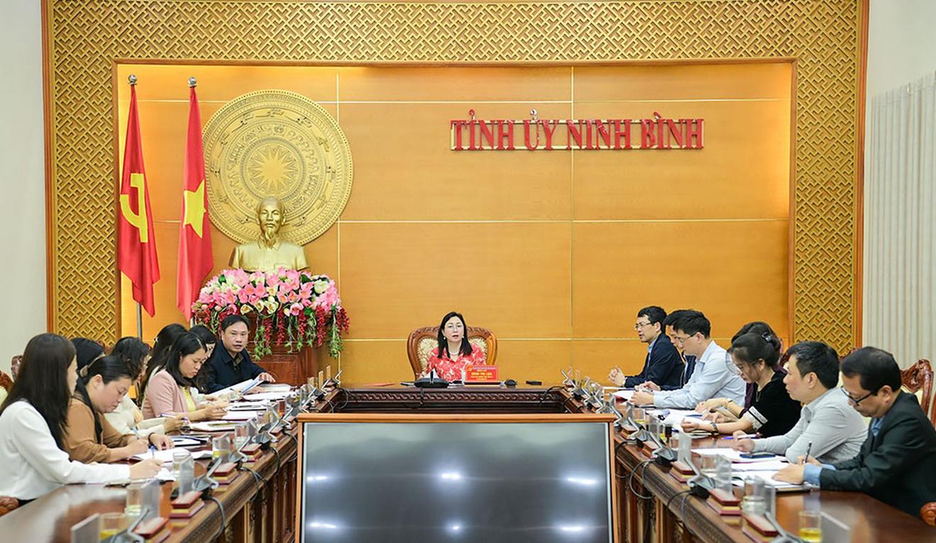 Phó Bí thư Thường trực Tỉnh ủy, Trưởng Ban Chỉ đạo 35 Đảng ủy các cơ quan Đảng tỉnh Ninh Bình Đinh Thị Lụa chủ trì tại hội nghị. Ảnh: Trần Thoan - Nguyễn Giang