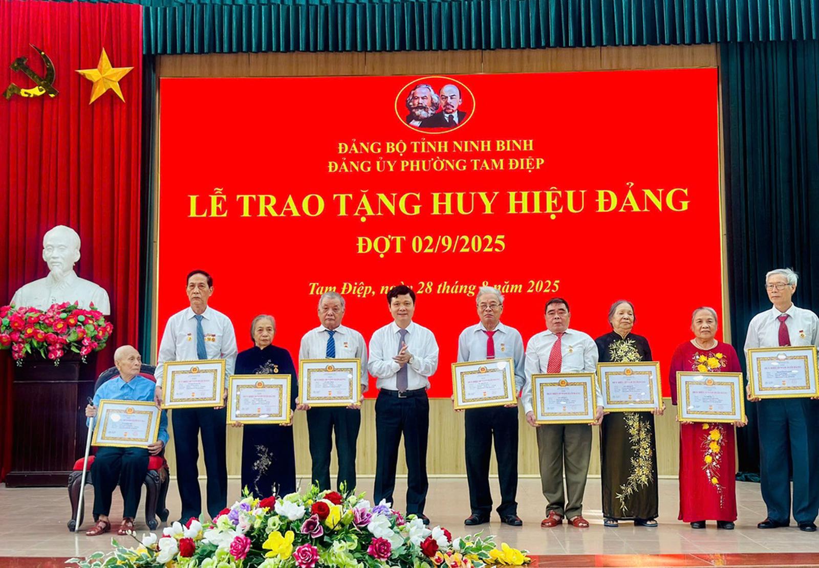 Bí thư Ban Chấp hành Đảng bộ phường Tam Điệp trao tặng huy hiệu Đảng cho các đảng viên lão thành. Ảnh: Tố Lan