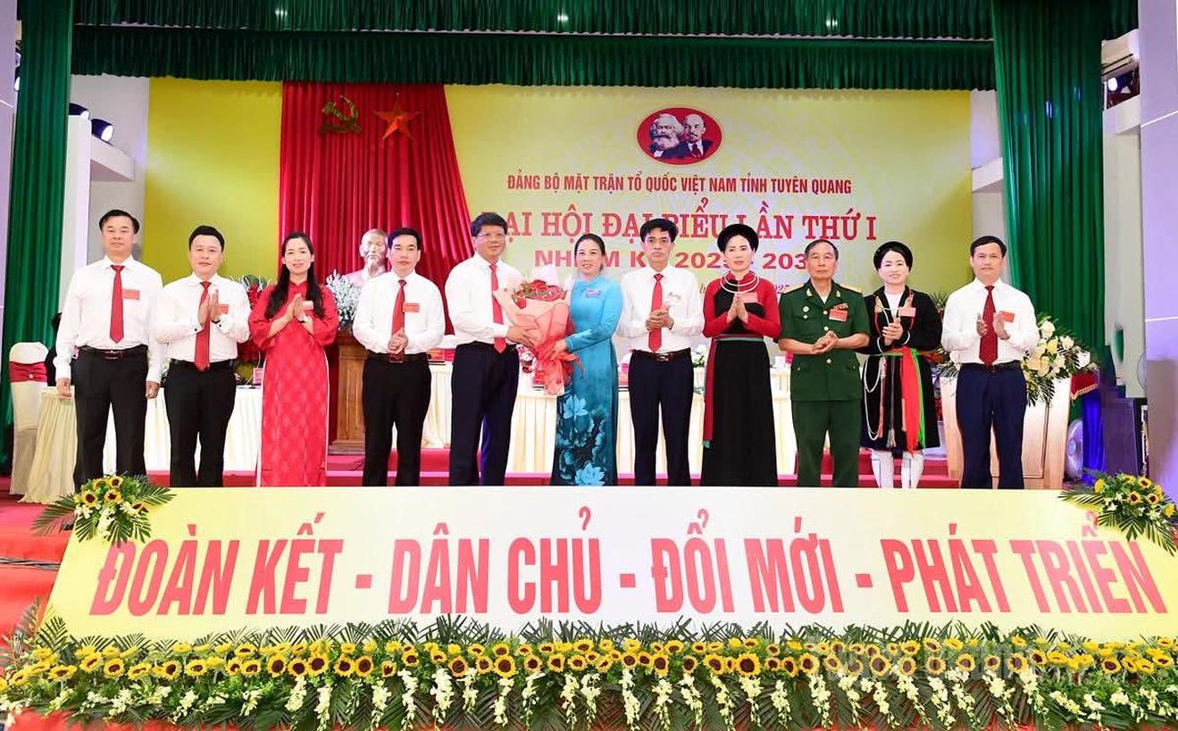 Bà Lê Thị Kim Dung, Phó Bí thư Thường trực Tỉnh ủy, Bí thư Đảng ủy các cơ quan Đảng tỉnh Tuyên Quang tặng hoa chúc mừng ông Hà Trung Kiên và Ban Chấp hành Đảng bộ MTTQ Việt Nam tỉnh Tuyên Quang. Ảnh: ND