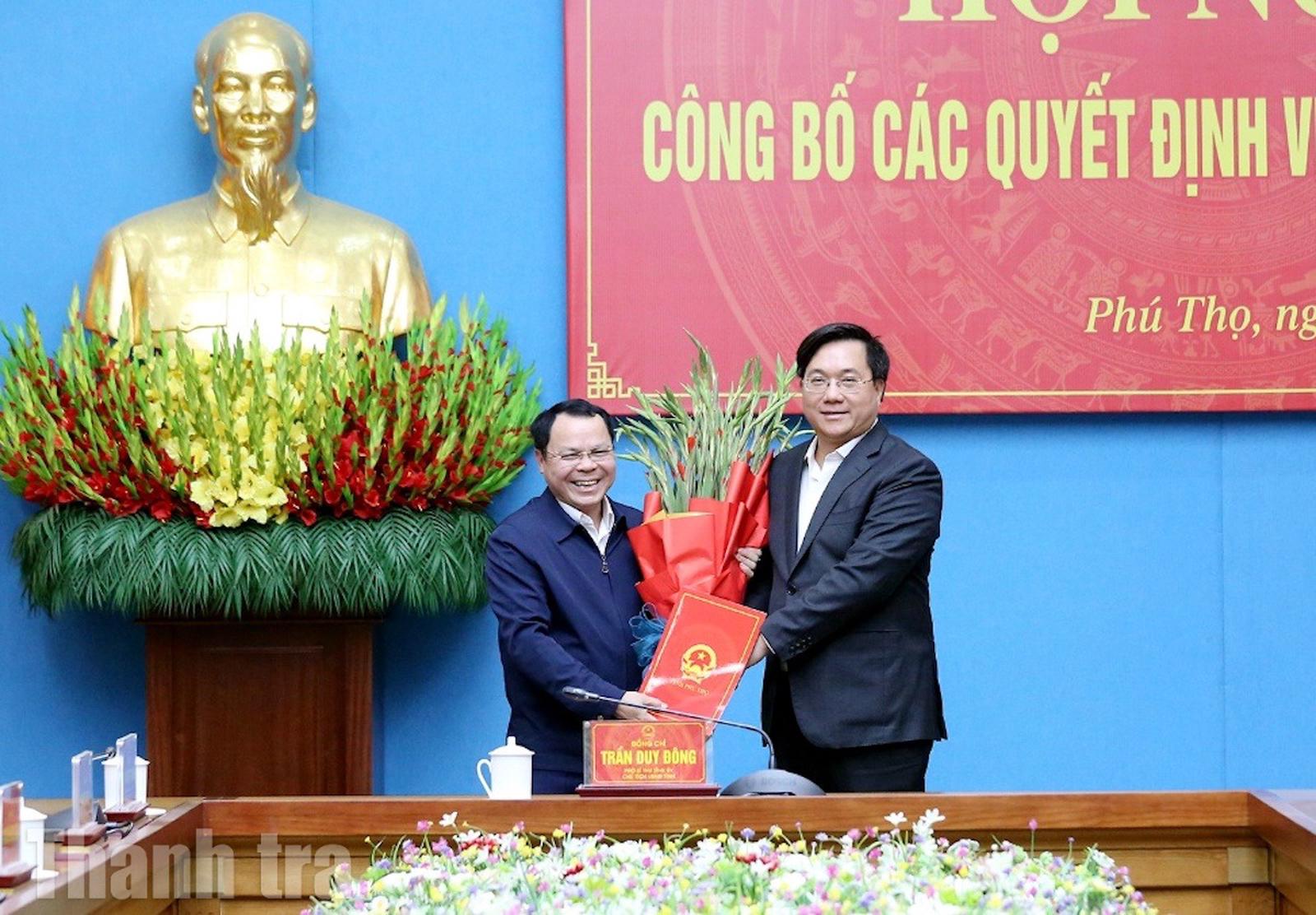 Chủ tịch UBND tỉnh Phú Thọ Trần Duy Đông trao quyết định bổ nhiệm và tặng hoa chúc mừng tân Chánh Thanh tra tỉnh Nguyễn Văn Thắng (bên phải) và tân Giám đốc Sở Dân tộc và Tôn giáo Nguyễn Hải (bên trái). Ảnh: PV