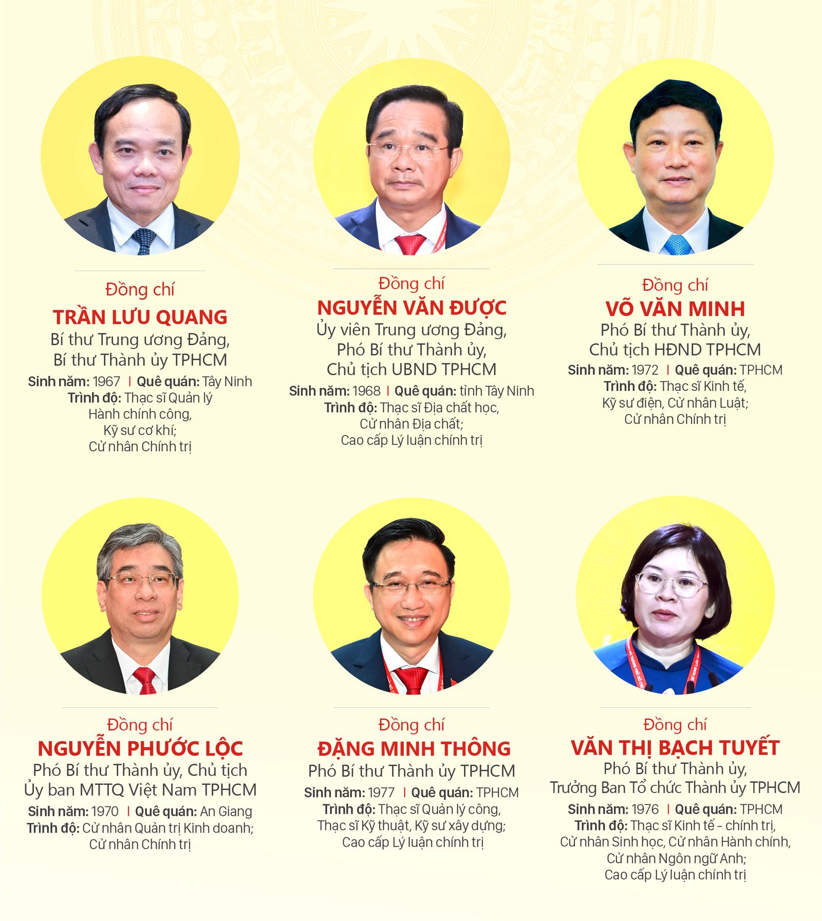 1. Đồng chí Trần Lưu Quang, Bí thư Trung ương Đảng, Bí thư Thành ủy Thành phố Hồ Chí Minh; sinh năm 1967, quê quán: Tây Ninh; trình độ: Thạc sĩ Quản lý hành chính công, Kỹ sư cơ khí, Cử nhân Chính trị.