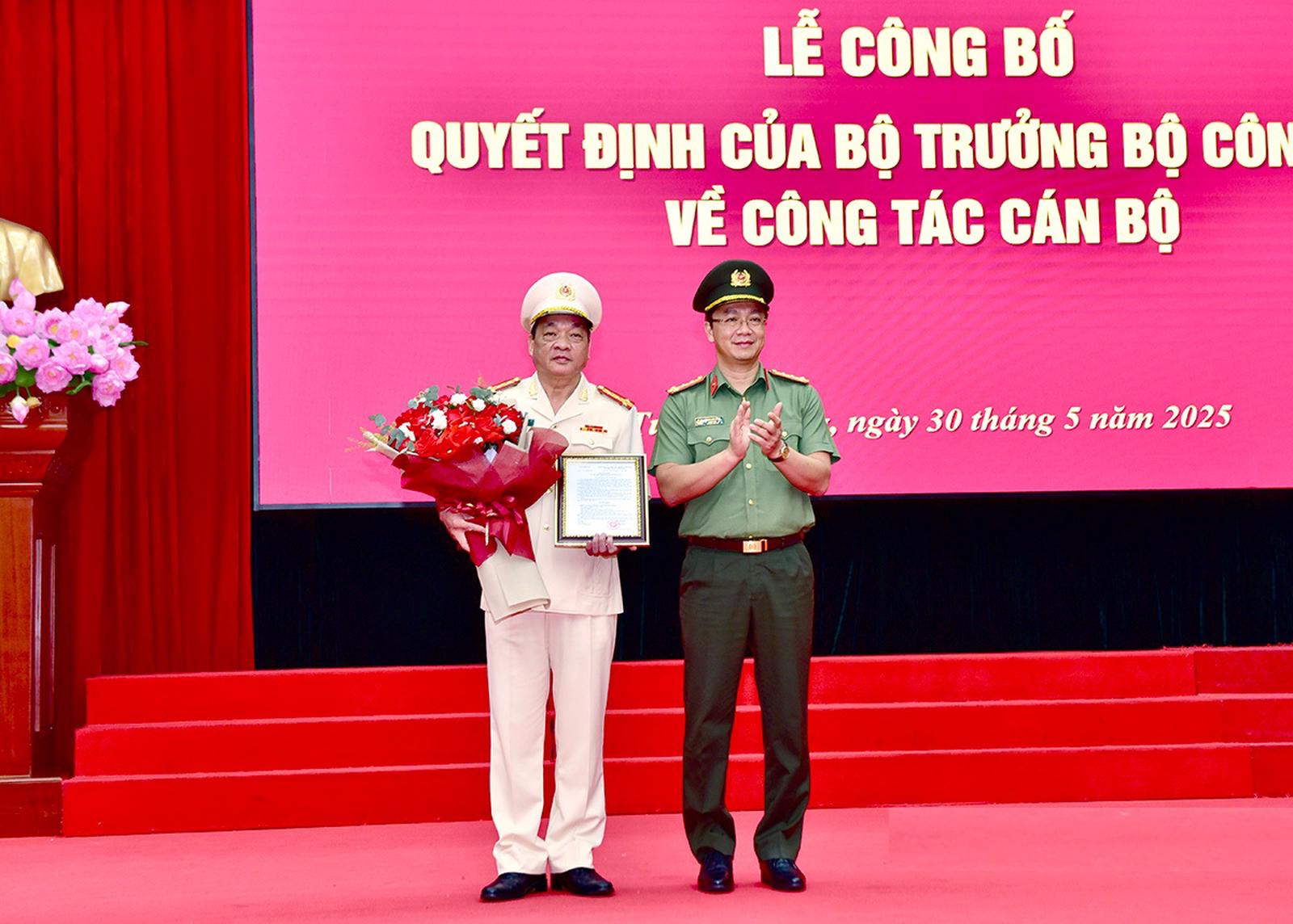Thừa uỷ quyền của Bộ trưởng Bộ Công an, Giám đốc Công an tỉnh Tuyên Quang Phạm Kim Đĩnh trao quyết định cho Đại tá Hà Phúc Thịnh. Ảnh: ND