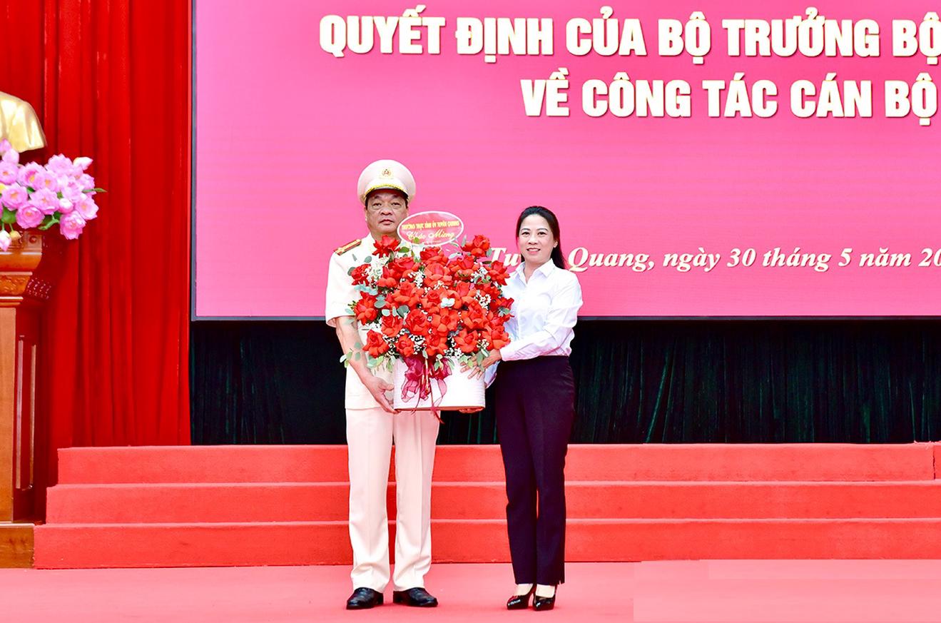 Phó Bí thư Thường trực Tỉnh uỷ, Chủ tịch HĐND tỉnh Tuyên Quang Lê Thị Kim Dung tặng hoa Đại tá Hà Phúc Thịnh. Ảnh: ND