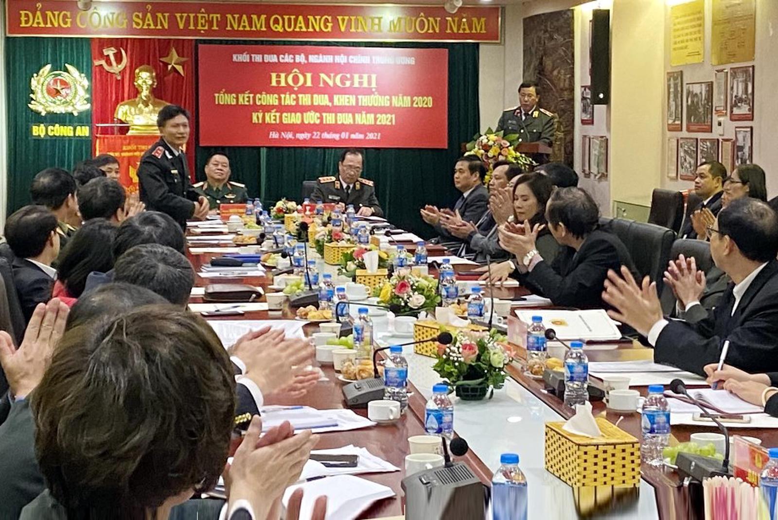 Tại hội nghị, Thứ trưởng Bộ Công an Nguyễn Văn Thành đã trao Cờ Luân lưu cho đại diện Bộ Quốc phòng - đơn vị Khối trưởng và đại diện Bộ Tư pháp - đơn vị Khối phó năm 2021.