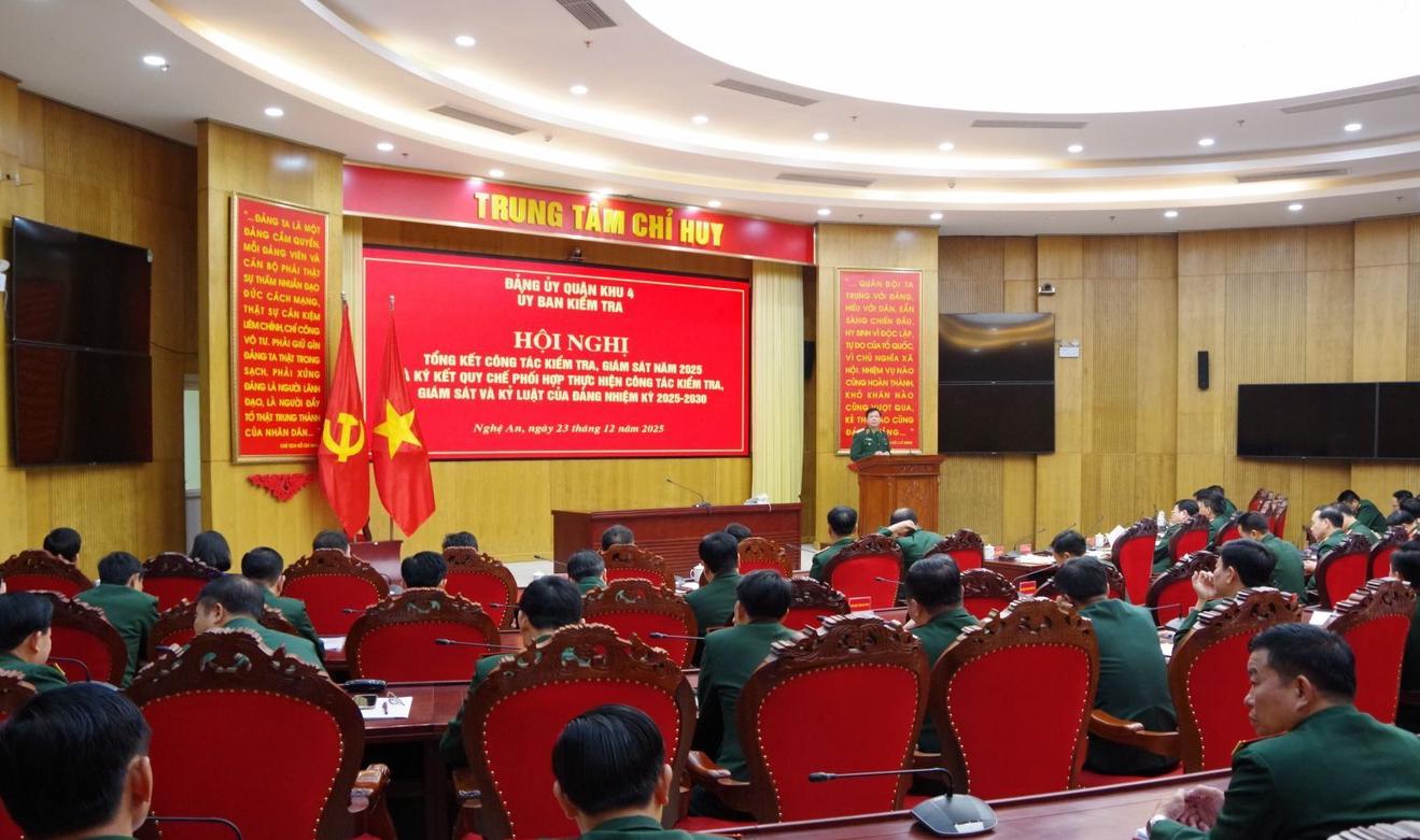 Ngày 23/12, Ủy ban Kiểm tra Đảng ủy Quân khu 4 tổ chức Hội nghị tổng kết công tác kiểm tra, giám sát năm 2025 và ký kết Quy chế phối hợp thực hiện công tác kiểm tra, giám sát và kỷ luật của Đảng nhiệm kỳ 2025–2030. Hội nghị do Thiếu tướng Lê Văn Trung, Ủy viên Ban Thường vụ Đảng ủy, Phó Chính ủy Quân khu, Chủ nhiệm Ủy ban Kiểm tra Đảng ủy Quân khu 4 chủ trì.
