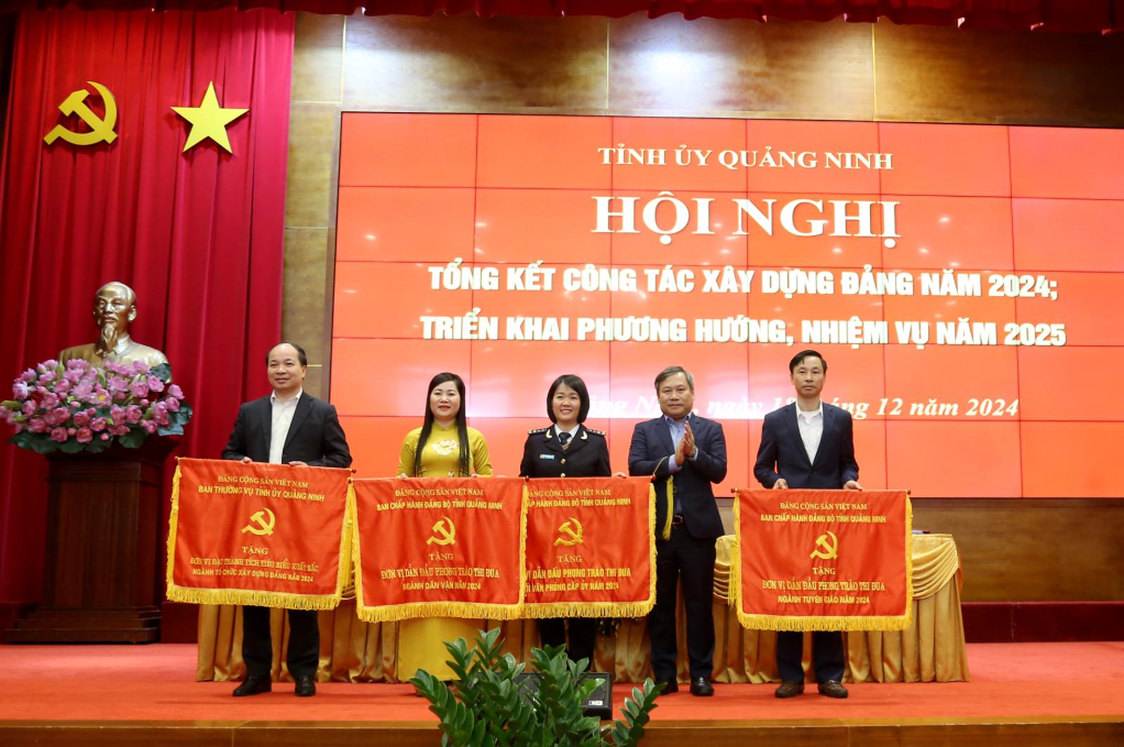 Bí thư Tỉnh ủy Quảng Ninh trao Cờ thi đua cho 4 tập thể có thành tích xuất sắc dẫn đầu trong phong trào thi đua ngành Tuyên giáo, Tổ chức xây dựng Đảng, Dân vận, Văn phòng cấp ủy năm 2024. Ảnh: TTTT