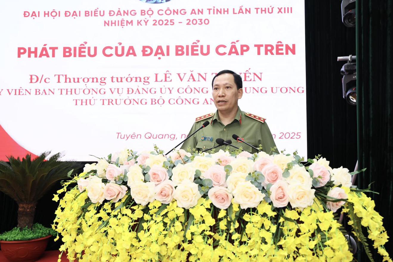 Thượng tướng Lê Văn Tuyến, Ủy viên Ban Thường vụ Đảng ủy Công an Trung ương, Thứ trưởng Bộ Công an phát biểu chỉ đạo tại Đại hội đại biểu Đảng bộ Công an tỉnh Tuyên Quang nhiệm kỳ 2025-2030. Ảnh: ND