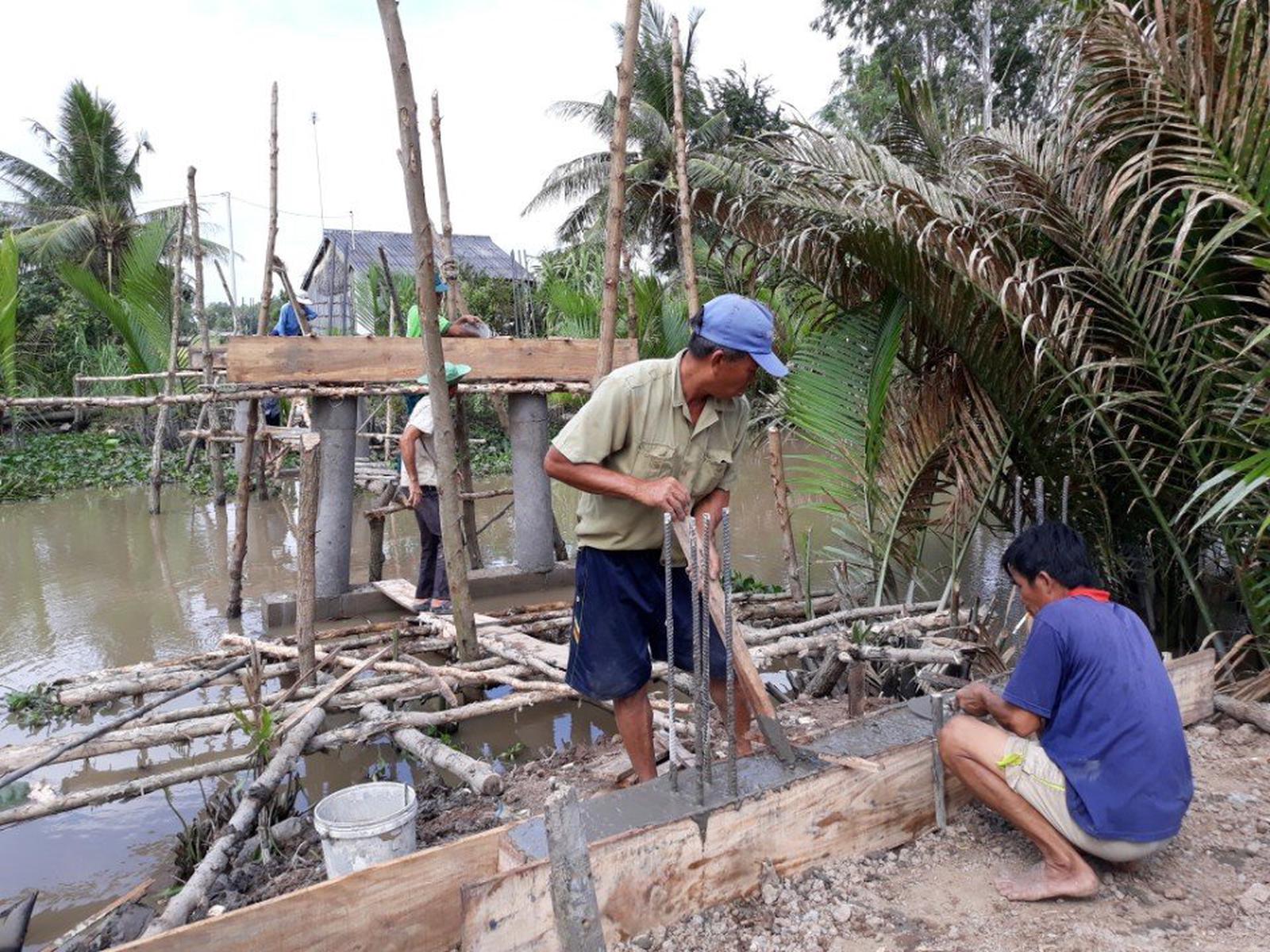 Đội xây cầu chùa Vĩnh Phước thi công cầu ở xã Gia Hòa 1, huyện Mỹ Xuyên, Sóc Trăng. Ảnh: Hoàng Văn