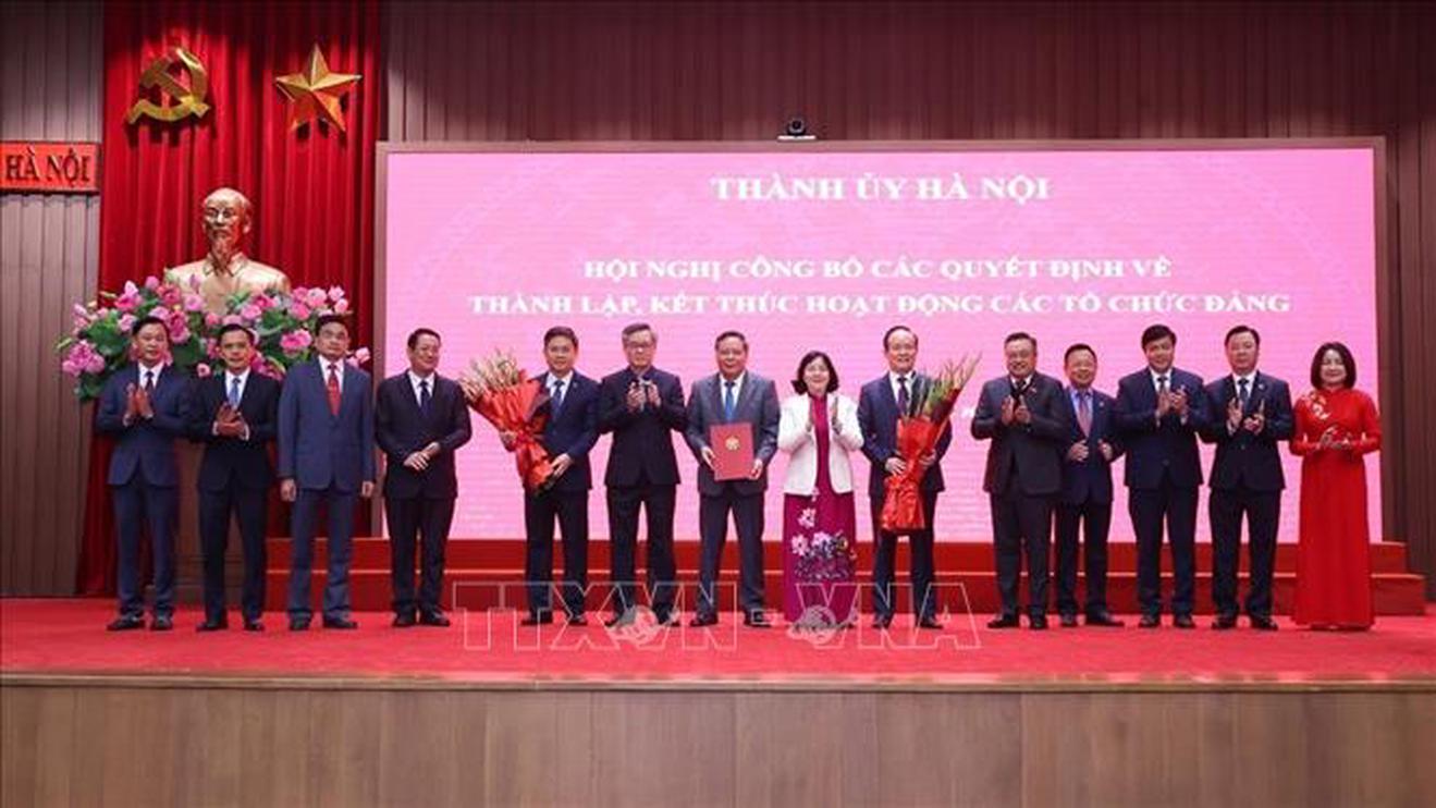 Ủy viên Bộ Chính trị, Bí thư Thành ủy Hà Nội Bùi Thị Minh Hoài và Ủy viên Trung ương Đảng, Phó Trưởng Ban Tổ chức Trung ương Nguyễn Quang Dương trao Quyết định thành lập Đảng bộ các cơ quan Đảng TP Hà Nội. Ảnh: Văn Điệp/TTXVN