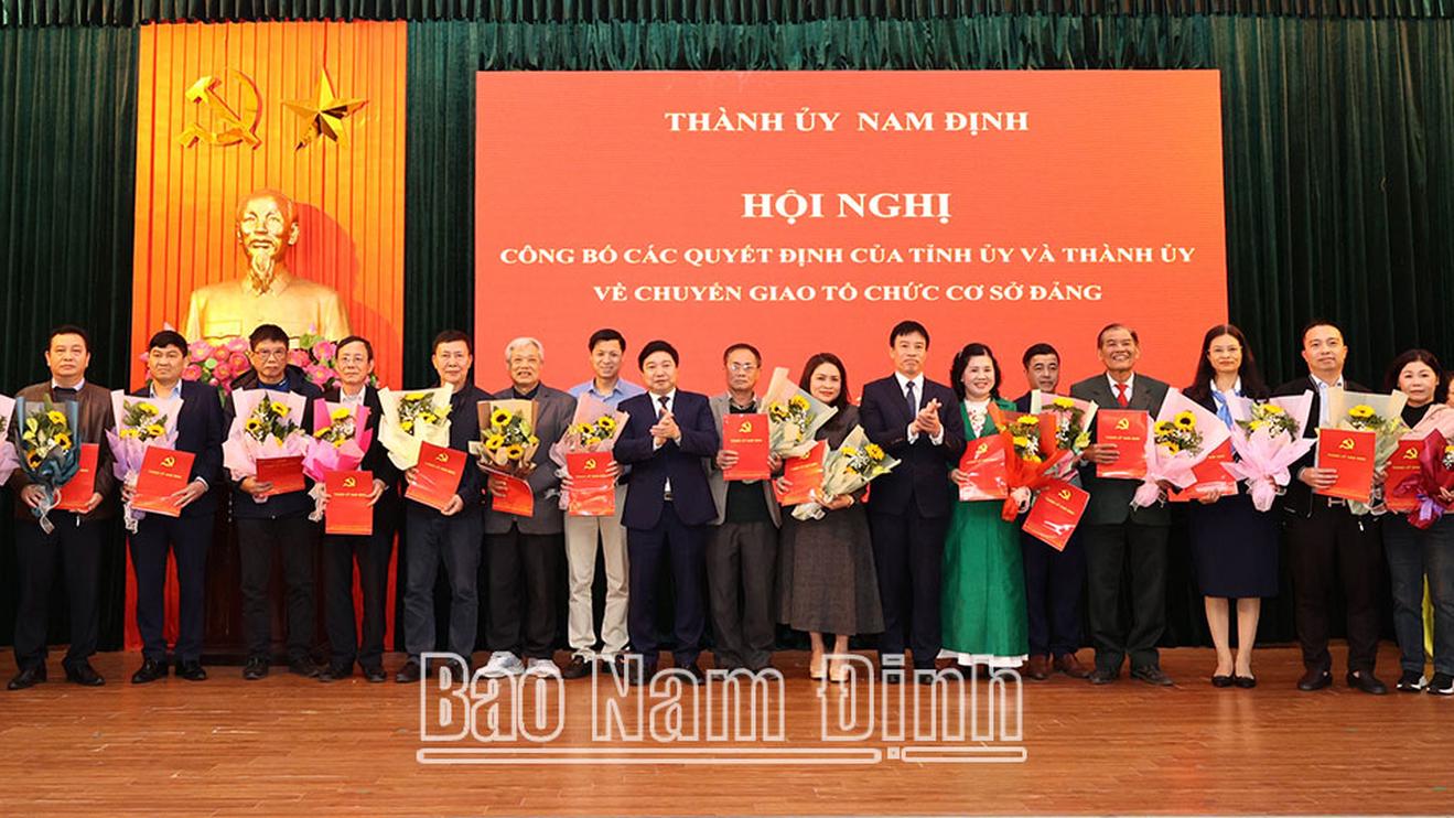 Lãnh đạo Thành uỷ Nam Định trao quyết định, tặng hoa chúc mừng các Đảng bộ, chi bộ mới chuyển giao về Đảng bộ thành phố Nam Định quản lý. Ảnh: BNĐ