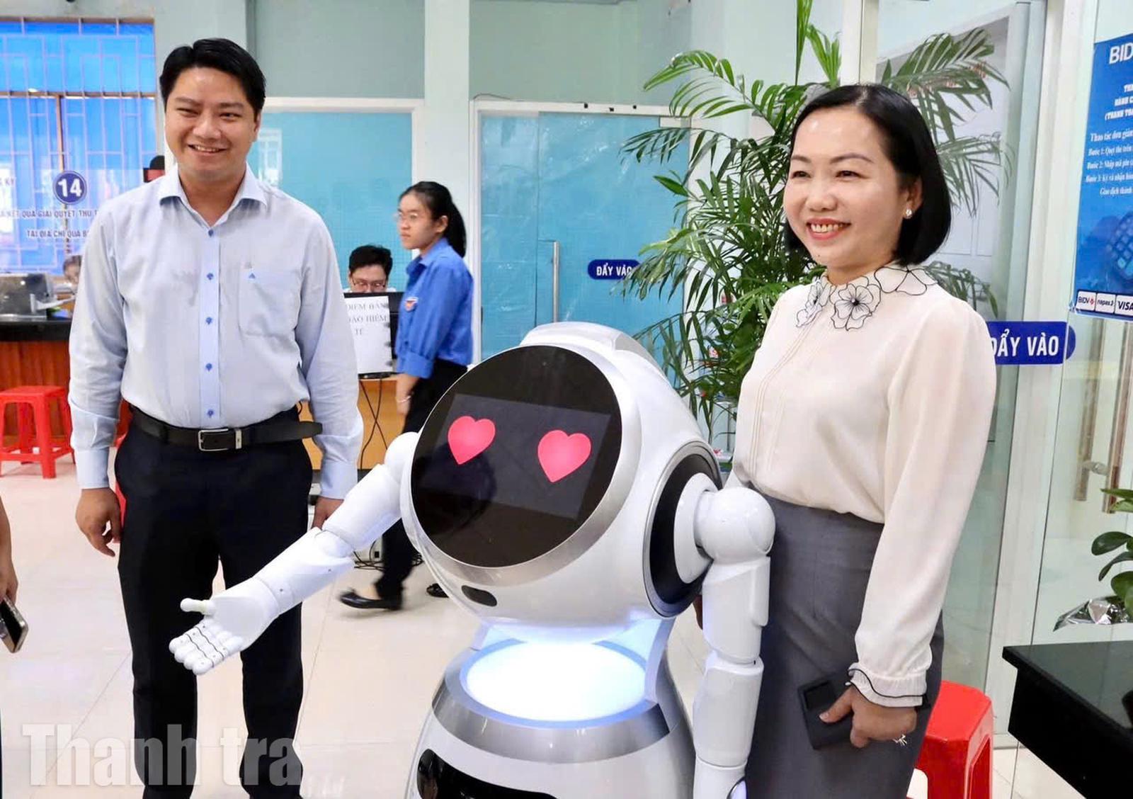 Bà Nguyễn Thu Cúc - Bí thư Đảng ủy và ông Trần Phong Lưu - Chủ tịch UBND phường Thủ Dầu Một hướng dẫn người dân tương tác với rô bốt tại Trung tâm Phục vụ hành chính công phường. Ảnh: ĐQ