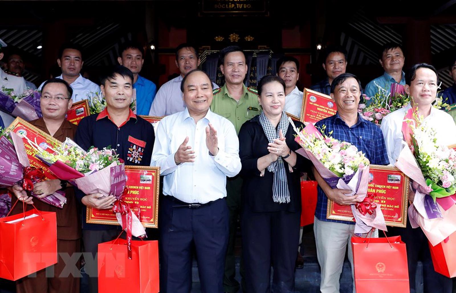 Thủ tướng Nguyễn Xuân Phúc, Chủ tịch Quốc hội Nguyễn Thị Kim Ngân tặng Quỹ khuyến học cho 16 xã vùng đệm của Vườn quốc gia Ba Vì, thành phố Hà Nội. (Ảnh: Thống Nhất/TTXVN)
