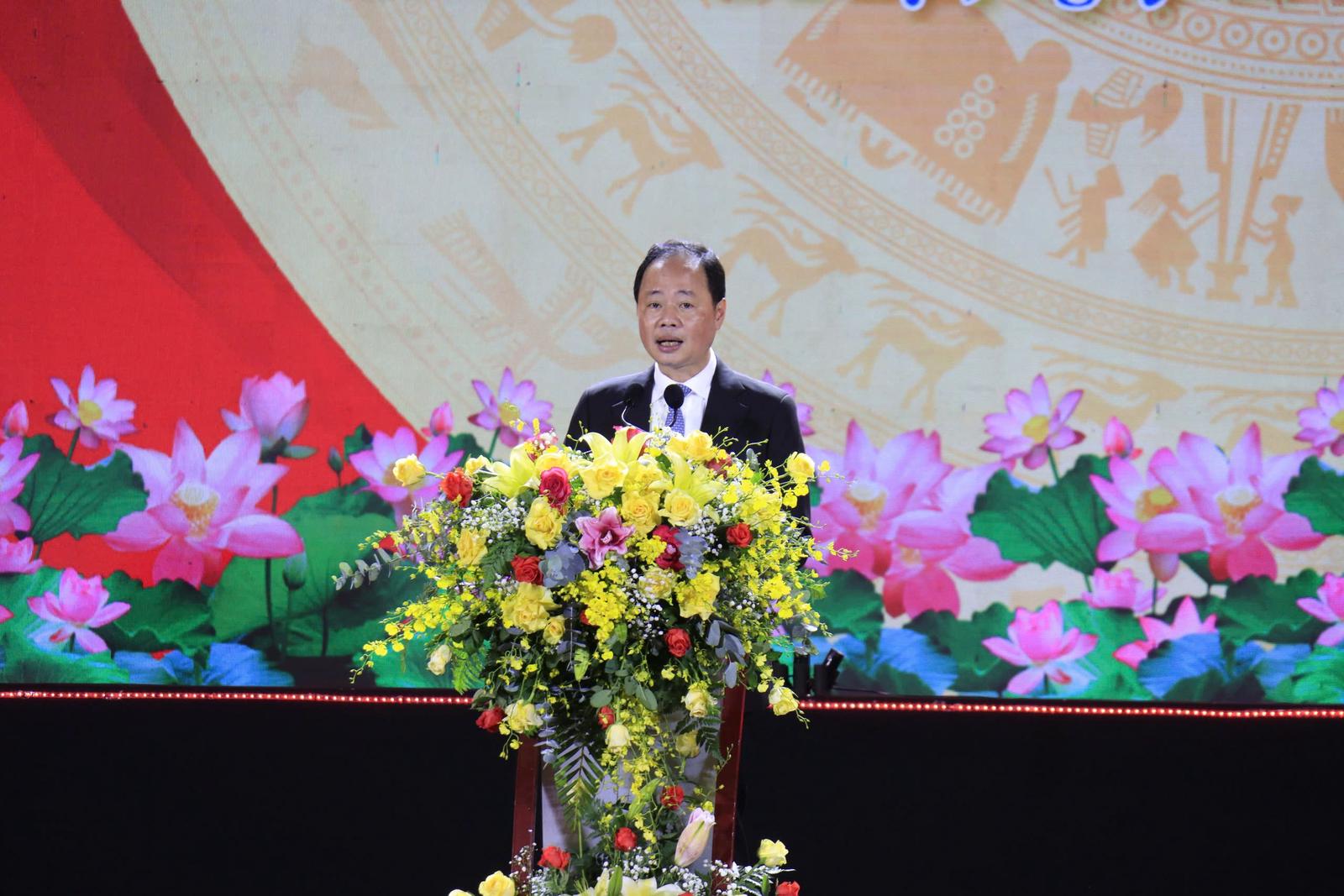 Chủ tịch UBND tỉnh Lâm Đồng Trần Hồng Thái ôn lại những sự kiện lịch sử đáng tự hào của quân và dân tỉnh Lâm Đồng cách đây 50 năm, cũng như truyền thống cách mạng sáng ngời của người dân và vùng đất Lâm Đồng tại lễ kỷ niệm. Ảnh: Vũ Linh