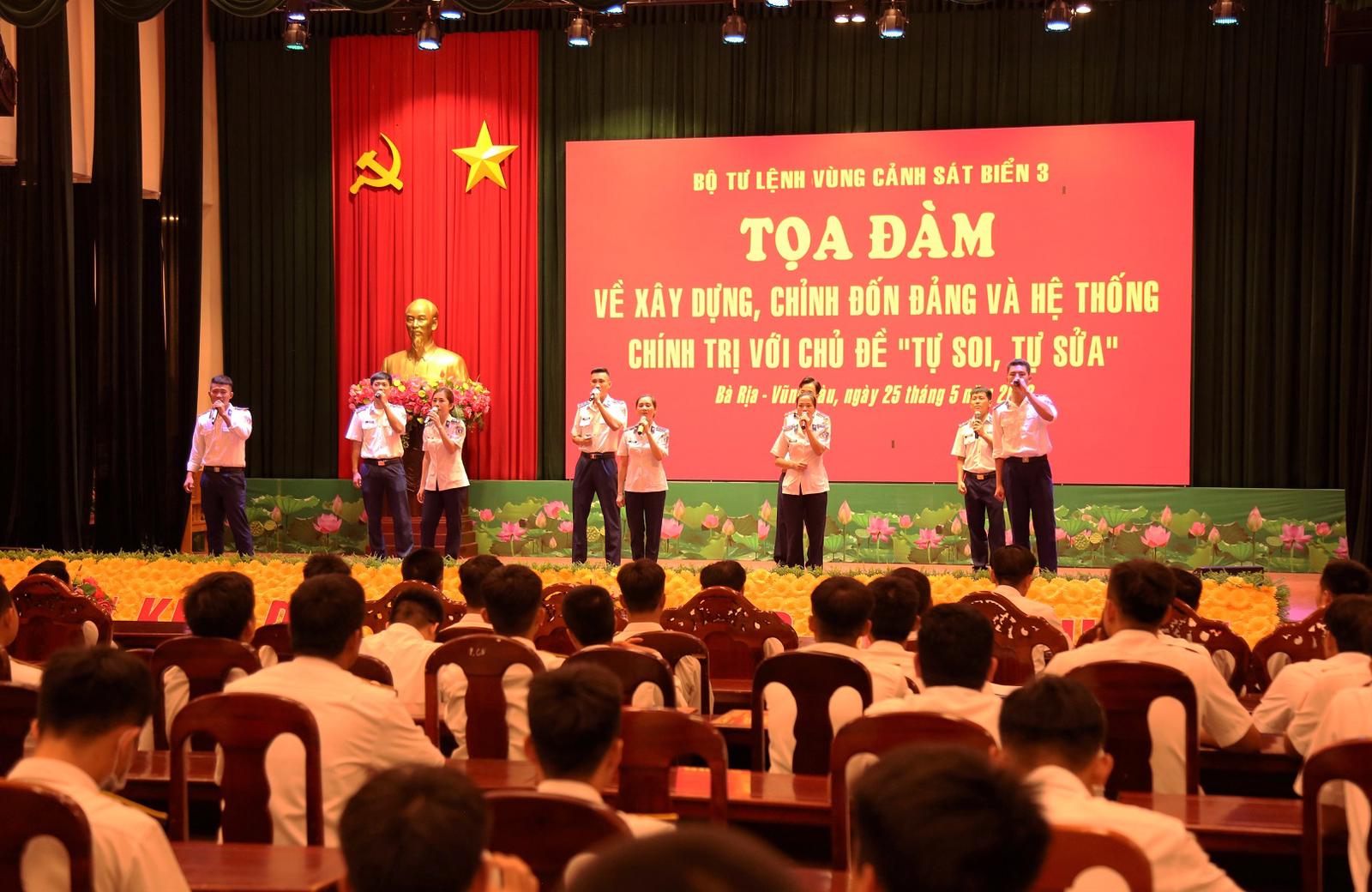 Buổi tọa đàm sinh hoạt chính trị về xây dựng, chỉnh đốn Đảng và hệ thống chính trị với chủ đề “Tự soi, tự sửa” do Đoàn Thanh niên Bộ Tư lệnh Vùng Cảnh sát biển 3 tổ chức vào tối ngày 25/5. Ảnh: AX