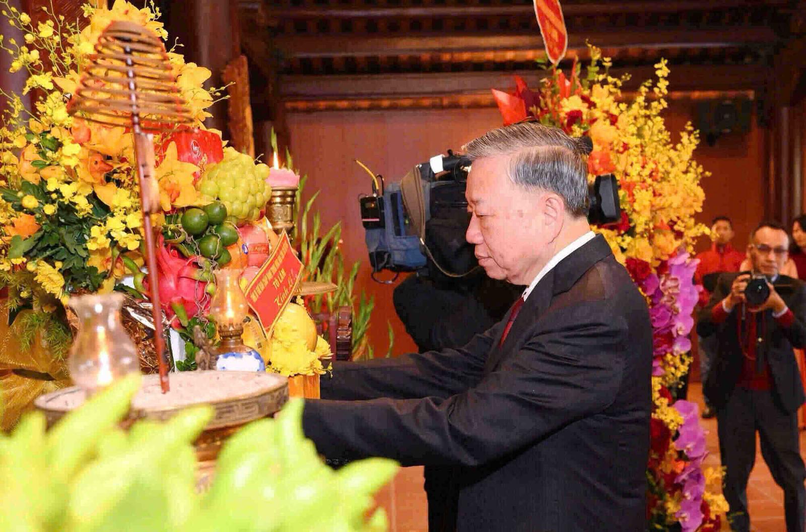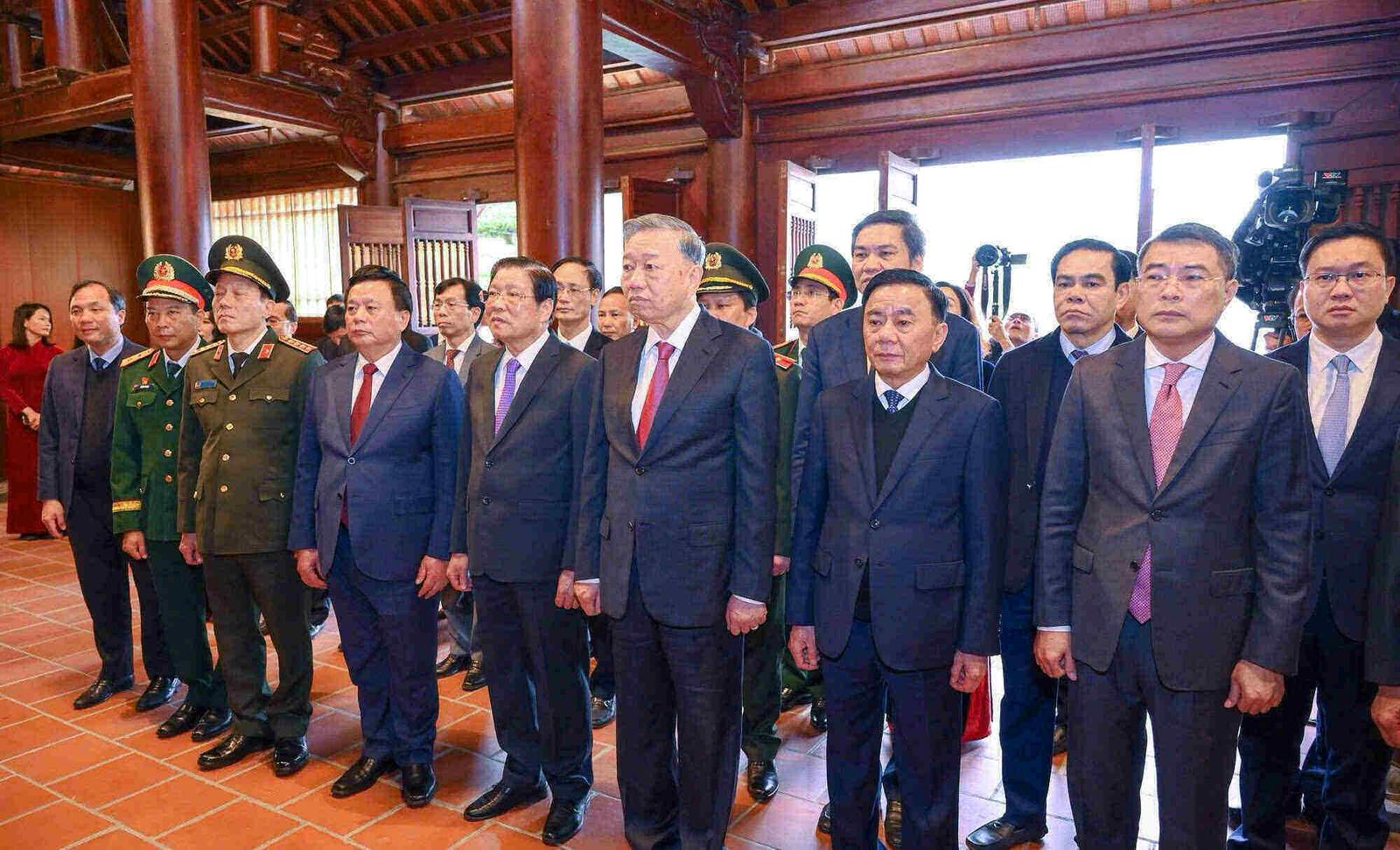 Tổng Bí thư Tô Lâm cùng đoàn công tác đi thăm và thắp hương tại Khu di tích Quốc gia đặc biệt Kim Liên. Ảnh: Thành Cường