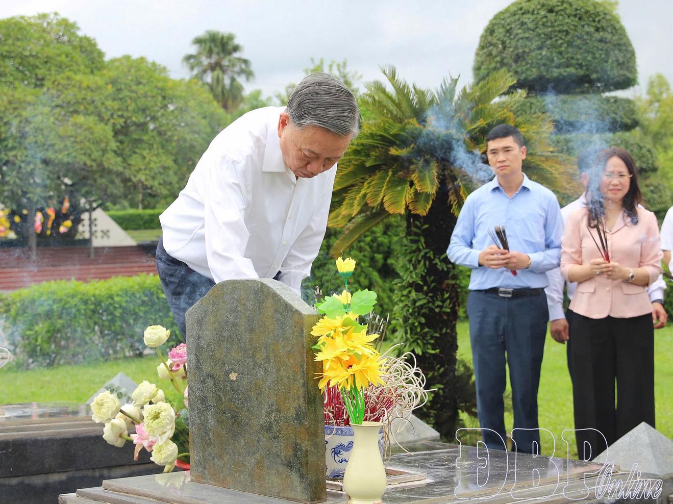 Tiếp đó, Tổng Bí thư Tô Lâm và Đoàn đại biểu đã dâng hương tưởng niệm các Anh hùng liệt sĩ tại Nghĩa trang liệt sĩ A1. Các đại biểu đã đặt vòng hoa, dâng hương lên đài tưởng niệm và từng phần mộ các Anh hùng liệt sĩ. Tổng Bí thư Tô Lâm đã ghi sổ lưu niệm tại Nghĩa trang liệt sĩ A1.