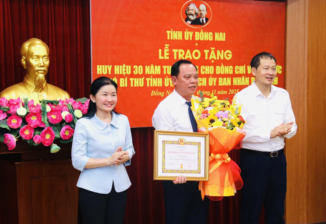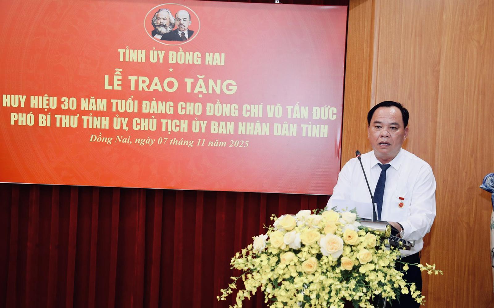 (Thanh tra) - Ban Thường vụ Tỉnh ủy Đồng Nai vừa tổ chức Lễ trao tặng Huy hiệu 30 năm tuổi Đảng cho Phó Bí thư Tỉnh ủy, Chủ tịch UBND tỉnh Đồng Nai Võ Tấn Đức. Sự kiện diễn ra trang trọng, thể hiện sự trân trọng của Đảng bộ tỉnh đối với quá trình rèn luyện, cống hiến và trưởng thành của người đứng đầu chính quyền tỉnh, một đảng viên gắn bó hơn ba thập kỷ với lý tưởng phụng sự Tổ quốc và Nhân dân.
