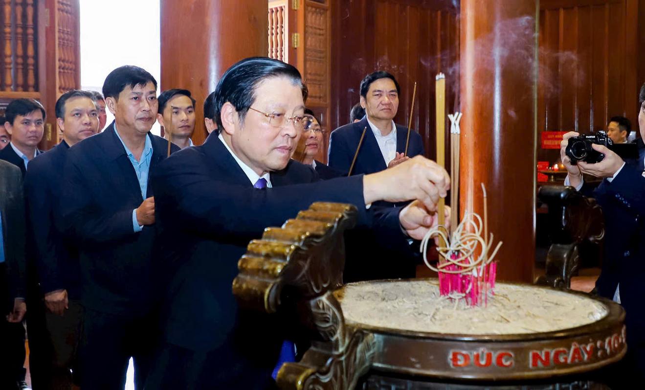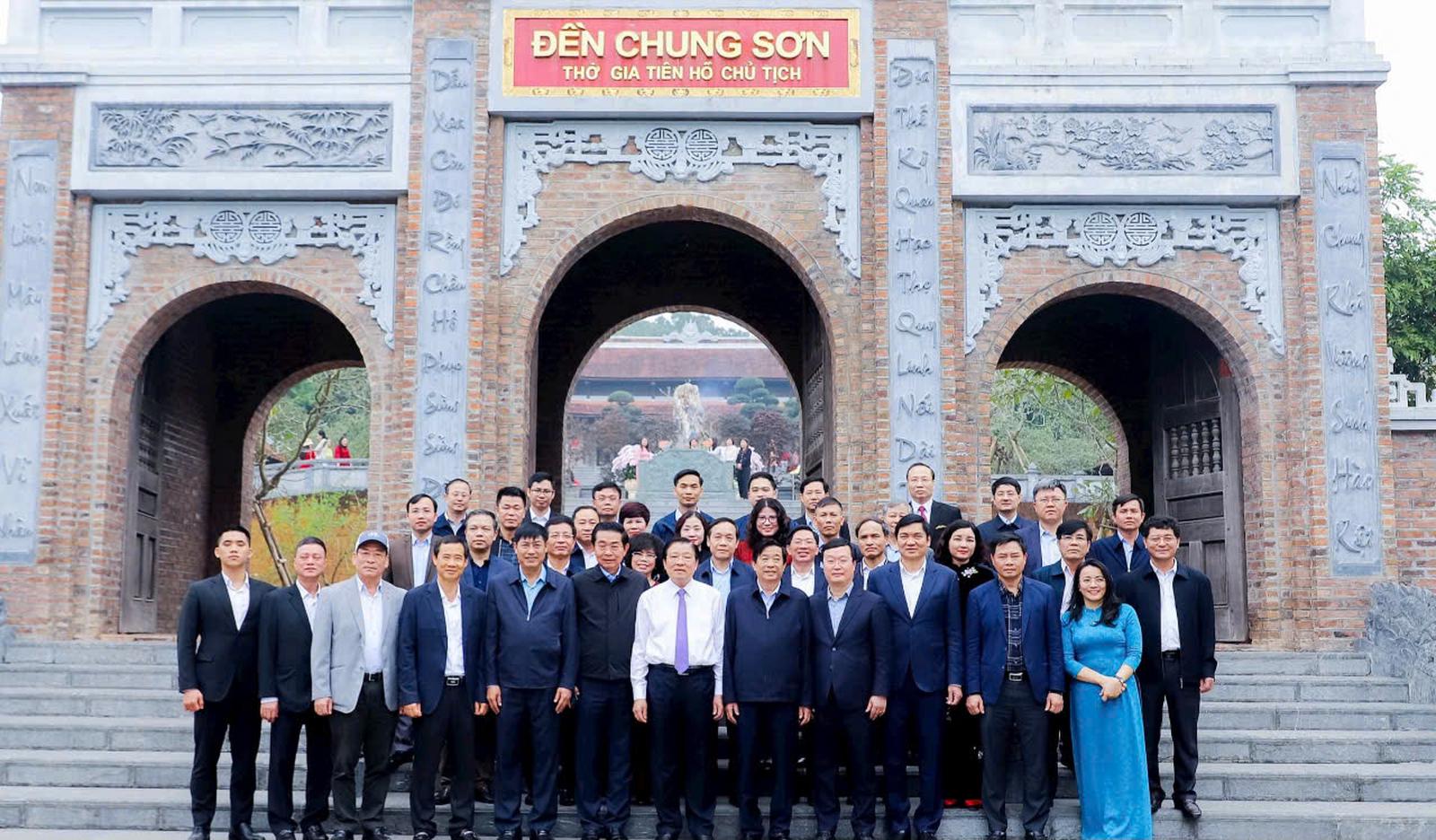Trước đó, đồng chí Phan Đình Trạc - Trưởng ban Nội chính Trung ương cùng Đoàn đã dâng lễ, dâng hoa, dâng hương tại đền Chung Sơn - đền thờ gia tiên Chủ tịch Hồ Chí Minh.