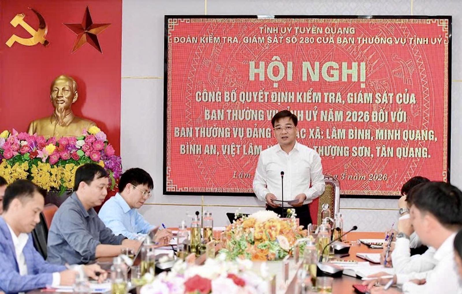 Tại xã Lâm Bình, ông Nguyễn Hưng Vượng, Chủ nhiệm Ủy ban Kiểm tra Tỉnh ủy, Trưởng đoàn kiểm tra, giám sát theo Quyết định số 280 của Ban Thường vụ Tỉnh ủy chủ trì hội nghị công bố quyết định kiểm tra, giám sát đối với Ban Thường vụ Đảng ủy các xã: Lâm Bình, Bình An, Minh Quang, Việt Lâm, Vị Xuyên, Thượng Sơn và Tân Quang.