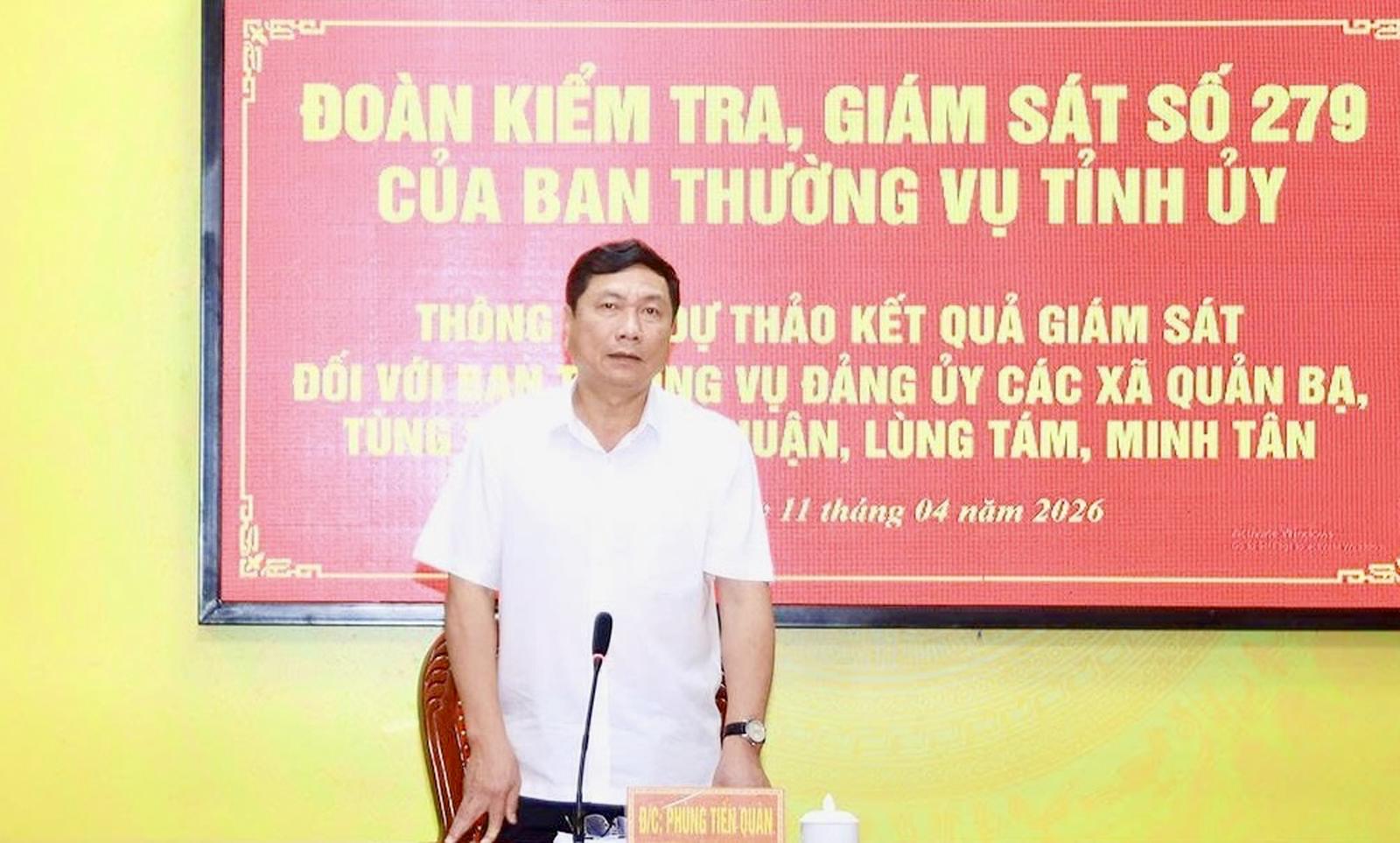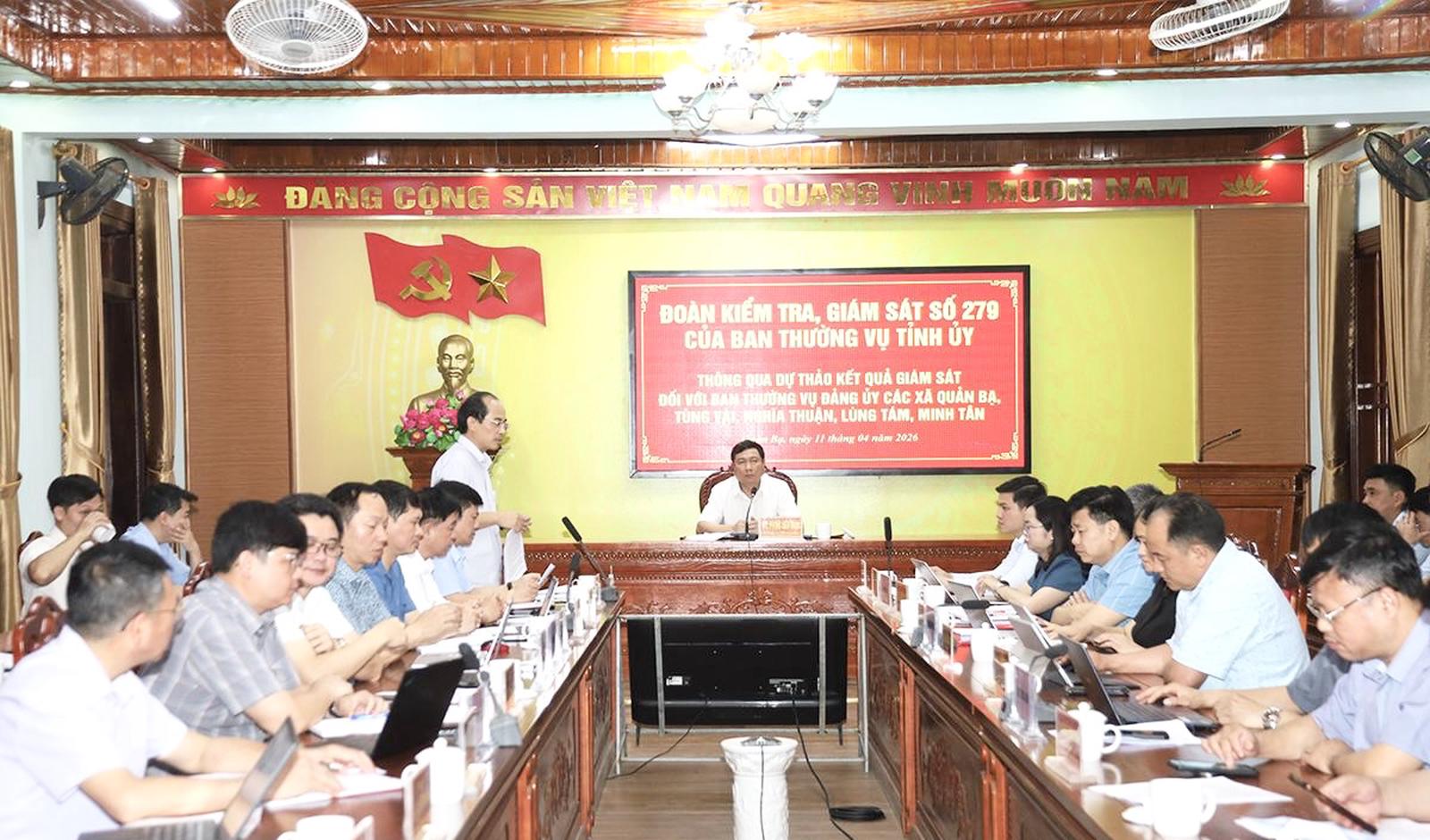 Hôm nay (11/4), Đoàn kiểm tra, giám sát số 279 của Ban Thường vụ Tỉnh ủy Tuyên Quang do Trưởng ban Nội chính Tỉnh ủy Phùng Tiến Quân làm Trưởng đoàn đã có buổi làm việc với Thường trực Đảng ủy các xã: Lùng Tám, Quản Bạ, Minh Tân, Nghĩa Thuận và Tùng Vài nhằm thông qua dự thảo báo cáo kết quả giám sát.