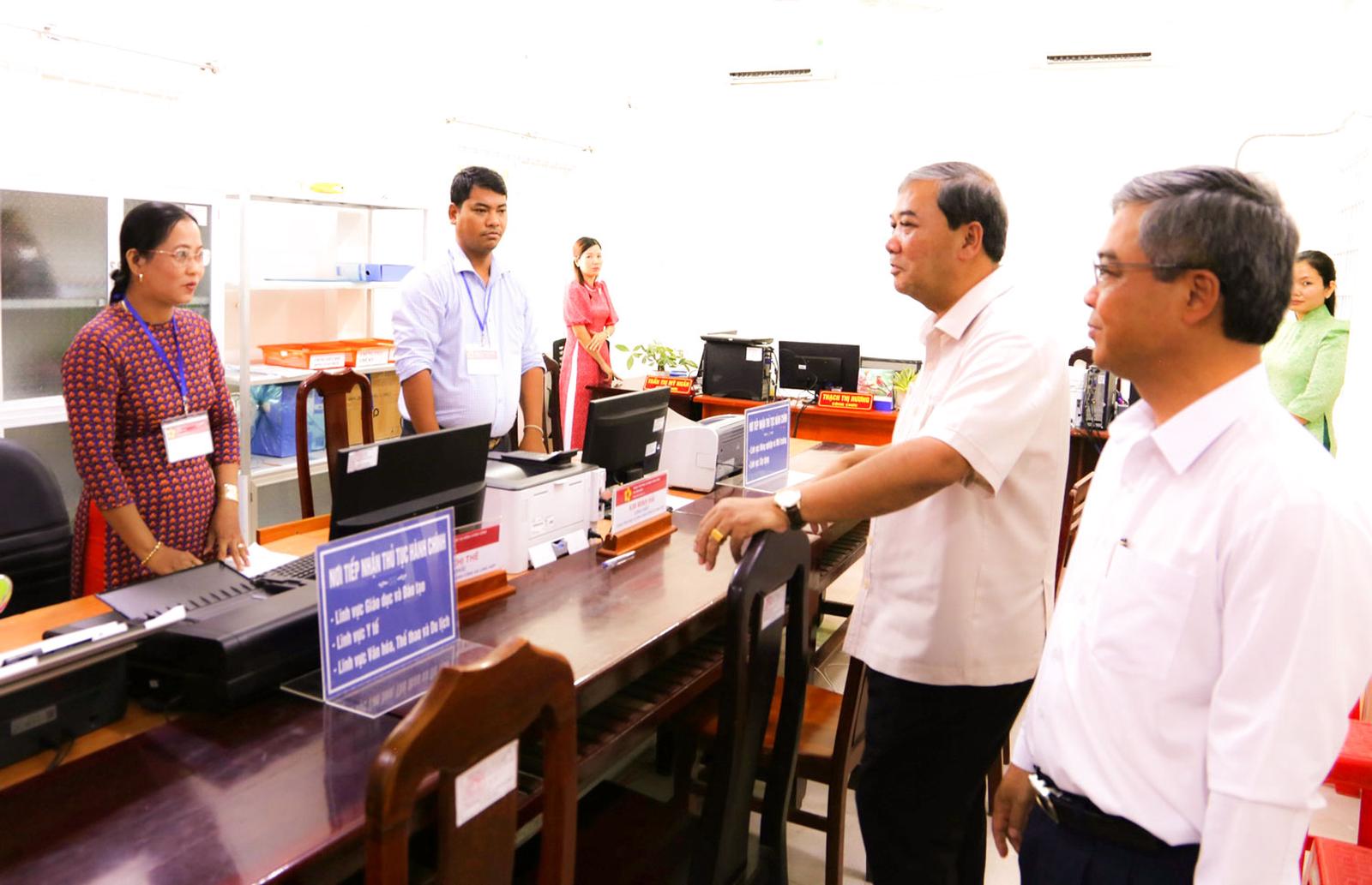 Phó Bí thư Tỉnh ủy Kim Ngọc Thái kiểm tra hoạt động tại Trung tâm Phục vụ hành chính công xã Long Hiệp. Ảnh: Ngọc Xoàn