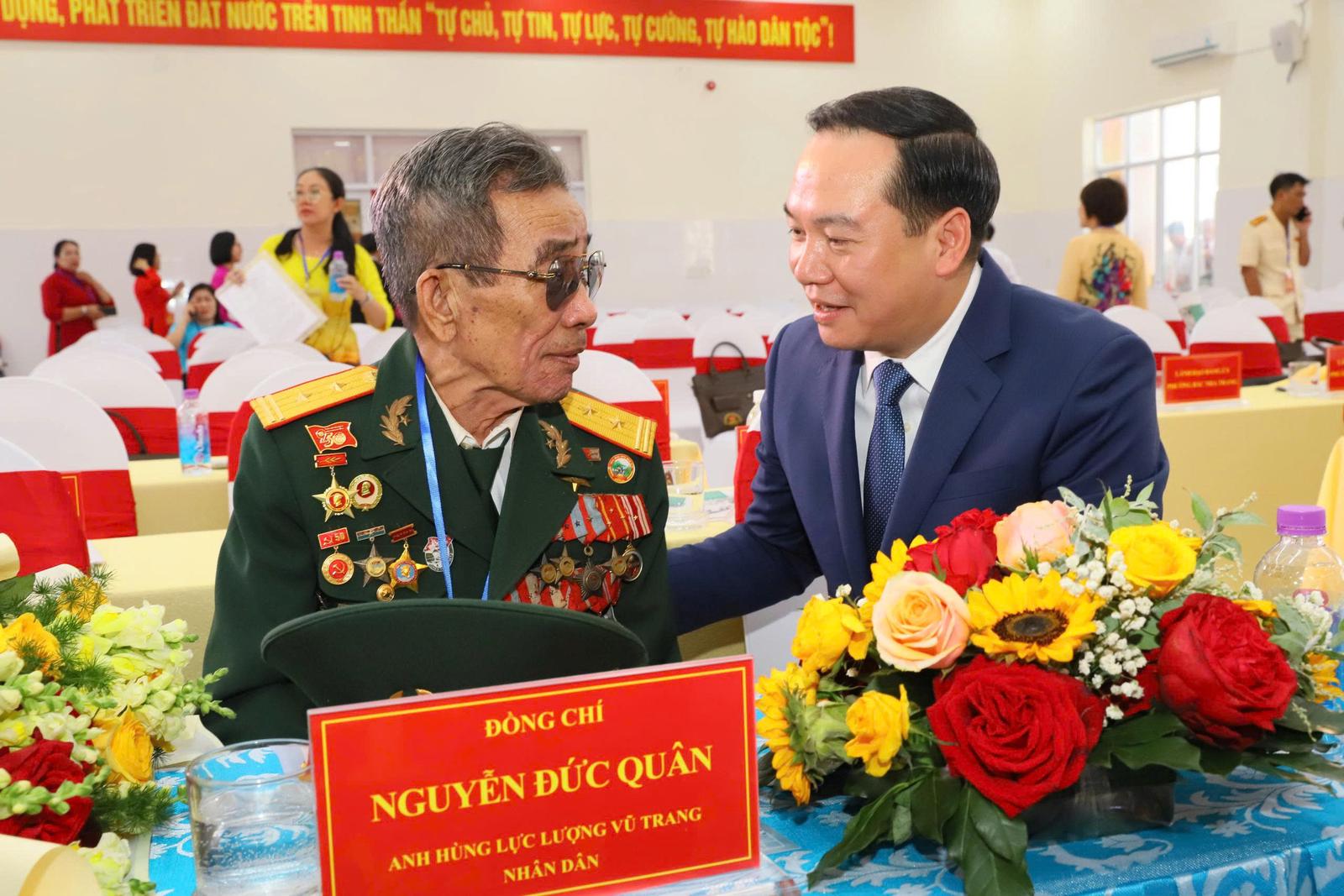 Phó Bí thư Tỉnh ủy Khánh Hòa Hồ Xuân Trường thăm hỏi Anh hùng Lực lượng vũ trang nhân dân Nguyễn Đức Quân tại Đại hội. Ảnh: CTV