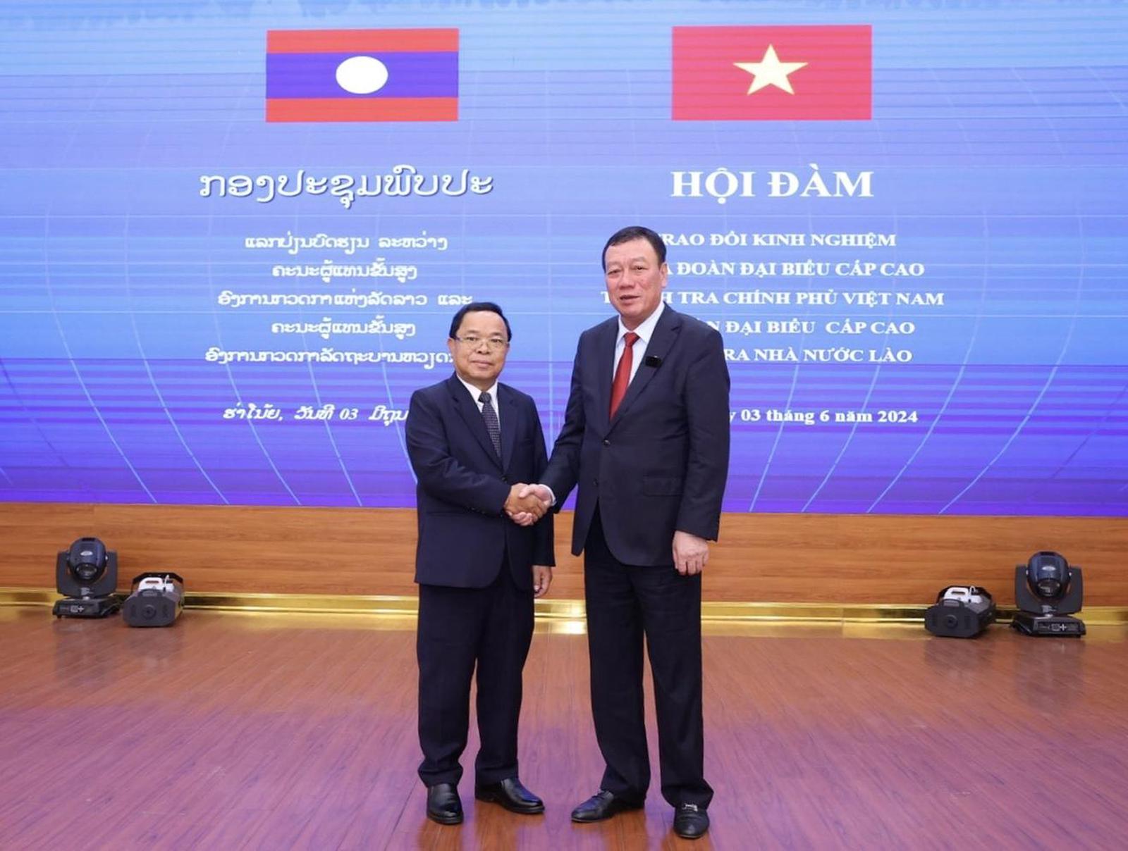 Tổng Thanh tra Chính phủ Việt Nam Đoàn Hồng Phong (phải ảnh) và Tổng Thanh tra Nhà nước Lào Khăm Phăn Phôm-Mạ-Thắt tại hội đàm chia sẻ kinh nghiệm về công tác thanh tra, giải quyết khiếu nại, tố cáo và phòng, chống tham nhũng, ngày 3/6/2024. Ảnh: Báo Thanh tra