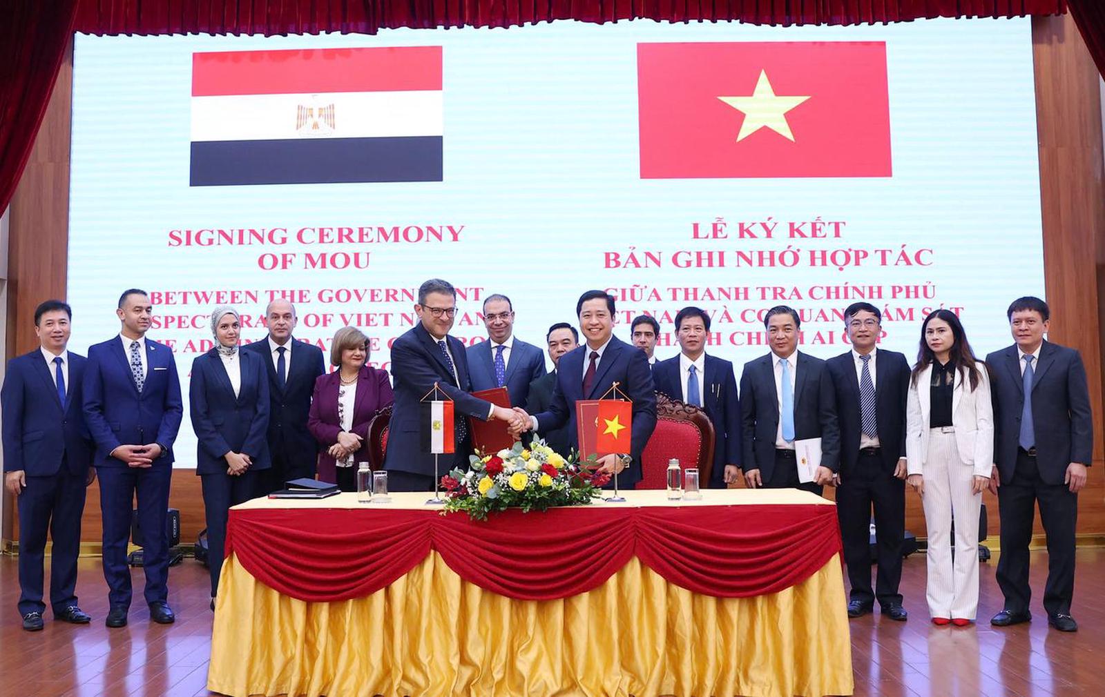 Thanh tra Chính phủ Việt Nam và Cơ quan Giám sát Hành chính Ai Cập ký kết lại Bản ghi nhớ hợp tác về phòng, chống tham nhũng, ngày 7/10. Ảnh: Báo Thanh tra