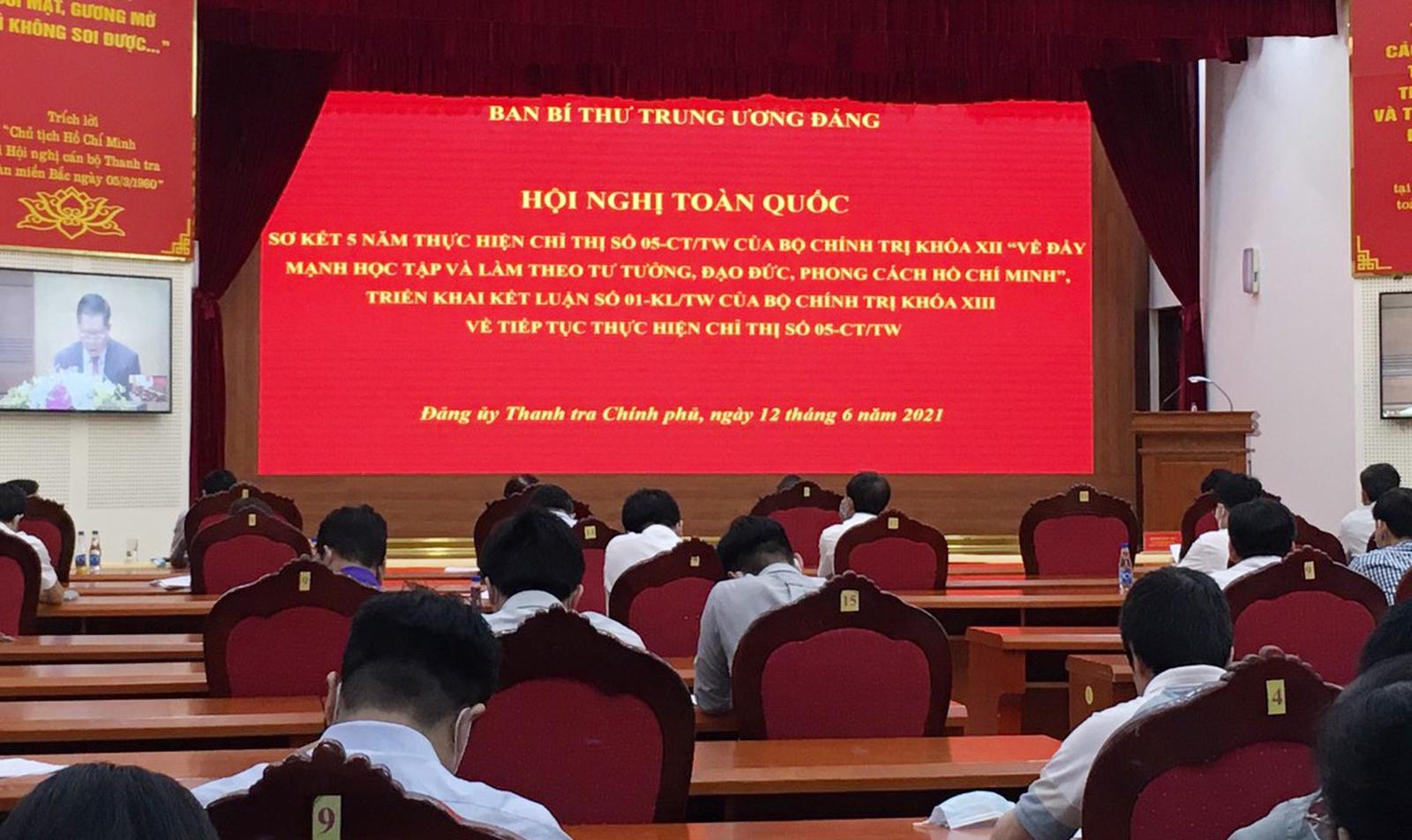 Tại điểm cầu Thanh tra Chính phủ có các Uỷ viên Ban Chấp hành Đảng bộ, Uỷ viên Uỷ ban Kiểm tra Đảng uỷ, thủ trưởng các cục, vụ, đơn vị… tham dự Hội nghị trực tuyến toàn quốc sơ kết 5 năm thực hiện Chỉ thị số 05 của Bộ Chính trị khóa XII “về đẩy mạnh học tập và làm theo tư tưởng, đạo đức, phong cách Hồ Chí Minh”, triển khai Kết luận số 01 của Bộ Chính trị khóa XIII về tiếp tục thực hiện Chỉ thị số 05, ngày 12/6/2021. Ảnh: P.Hiếu