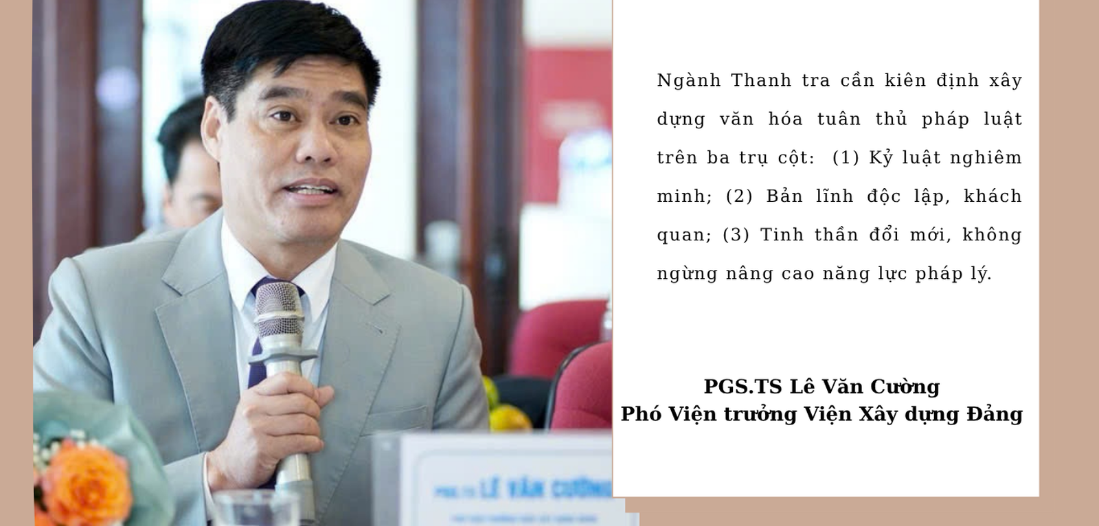 PGS.TS Lê Văn Cường nhấn mạnh, khi ba trụ cột này được thực hiện đồng bộ, văn hoá tuân thủ pháp luật sẽ trở thành chuẩn mực bền vững trong ngành Thanh tra, giúp ngành thực hiện tốt sứ mệnh của mình: Bảo vệ kỷ cương pháp luật, củng cố niềm tin của Nhân dân, góp phần xây dựng Nhà nước pháp quyền XHCN thực chất, hiệu quả.