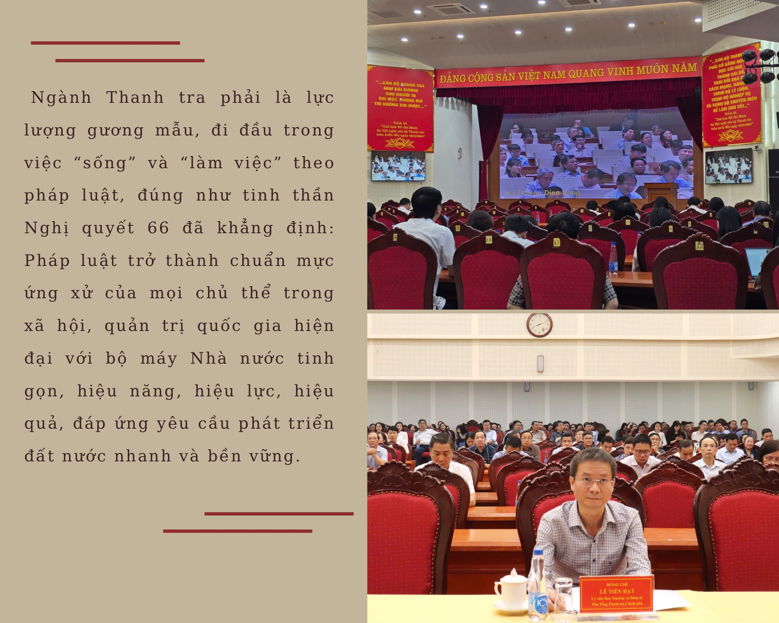 Chính vì vậy, ngành Thanh tra phải là lực lượng gương mẫu, đi đầu trong việc “sống” và “làm việc” theo pháp luật, đúng như tinh thần Nghị quyết 66 đã khẳng định: Pháp luật trở thành chuẩn mực ứng xử của mọi chủ thể trong xã hội, quản trị quốc gia hiện đại với bộ máy Nhà nước tinh gọn, hiệu năng, hiệu lực, hiệu quả, đáp ứng yêu cầu phát triển đất nước nhanh và bền vững.