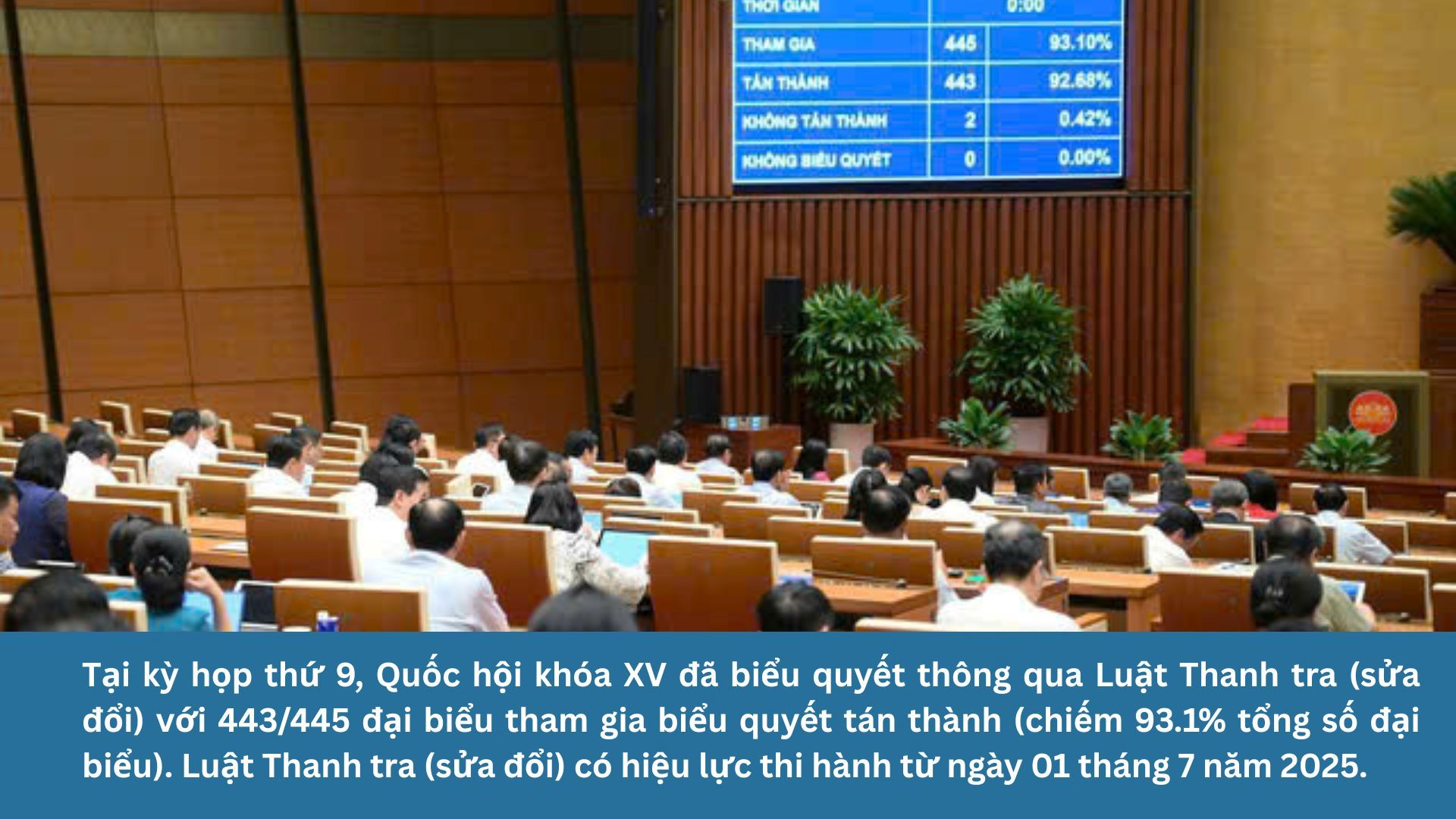 Vào cuối tháng 6/2026, tại kỳ họp thứ 9, Quốc hội khóa XV đã biểu quyết thông qua Luật Thanh tra (sửa đổi) với 443/445 đại biểu tham gia biểu quyết tán thành (chiếm 93.1% tổng số đại biểu). Luật Thanh tra (sửa đổi) có hiệu lực thi hành từ ngày 1 tháng 7 năm 2025.