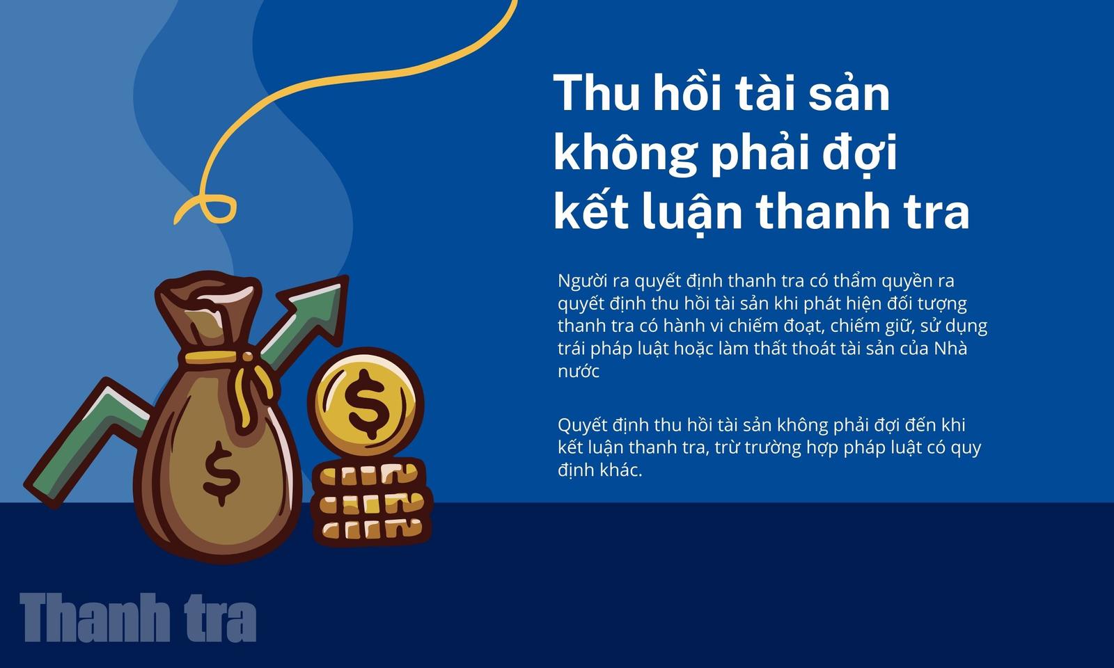 Theo Điều 49 Luật Thanh tra năm 2025, người ra quyết định thanh tra có thẩm quyền ra quyết định thu hồi tài sản khi phát hiện đối tượng thanh tra có hành vi chiếm đoạt, chiếm giữ, sử dụng trái pháp luật hoặc làm thất thoát tài sản của Nhà nước. Đáng chú ý, quyết định thu hồi tài sản không phải đợi đến khi kết luận thanh tra, trừ trường hợp pháp luật có quy định khác.
