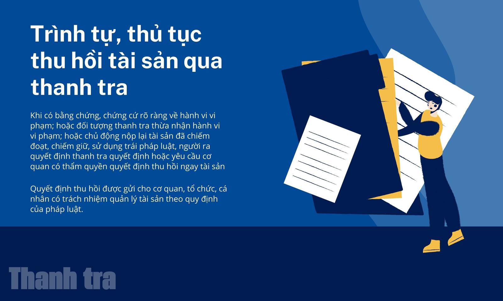 Trình tự, thủ tục thu hồi tài sản thông qua hoạt động thanh tra được quy định cụ thể tại Điều 64, Mục 3, Chương VIII, Nghị định 216/2025/NĐ-CP. Theo đó, khi có bằng chứng, chứng cứ rõ ràng về hành vi vi phạm; hoặc đối tượng thanh tra thừa nhận hành vi vi phạm; hoặc chủ động nộp lại tài sản đã chiếm đoạt, chiếm giữ, sử dụng trái pháp luật, người ra quyết định thanh tra quyết định hoặc yêu cầu cơ quan có thẩm quyền quyết định thu hồi ngay tài sản. Quyết định thu hồi được gửi cho cơ quan, tổ chức, cá nhân có trách nhiệm quản lý tài sản theo quy định của pháp luật.