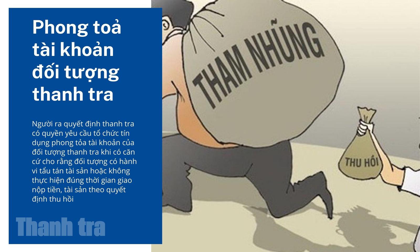 Bên cạnh đó, theo Điều 48 Luật Thanh tra năm 2025 và Điều 58, Mục 2 Chương VIII, Nghị định số 216/2025/NĐ-CP, người ra quyết định thanh tra có quyền yêu cầu tổ chức tín dụng phong tỏa tài khoản của đối tượng thanh tra khi có căn cứ cho rằng đối tượng có hành vi tẩu tán tài sản hoặc không thực hiện đúng thời gian giao nộp tiền, tài sản theo quyết định thu hồi.