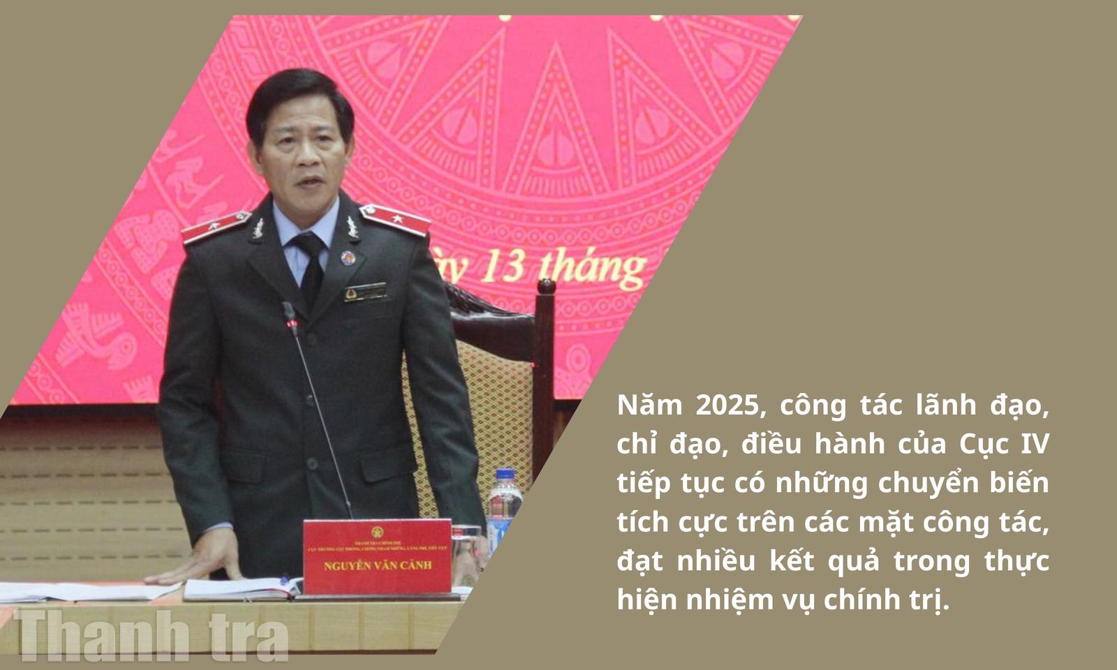 Năm 2025, trong bối cảnh đồng thời thực hiện chủ trương mang tính cách mạng về sắp xếp, tinh gọn tổ chức bộ máy và nhiều nhiệm vụ chính trị quan trọng khác, song công tác phòng, chống tham nhũng, lãng phí, tiêu cực vẫn được cấp ủy, lãnh đạo Cục IV xác định là nhiệm vụ quan trọng, thường xuyên và đẩy mạnh thực hiện trên các lĩnh vực.