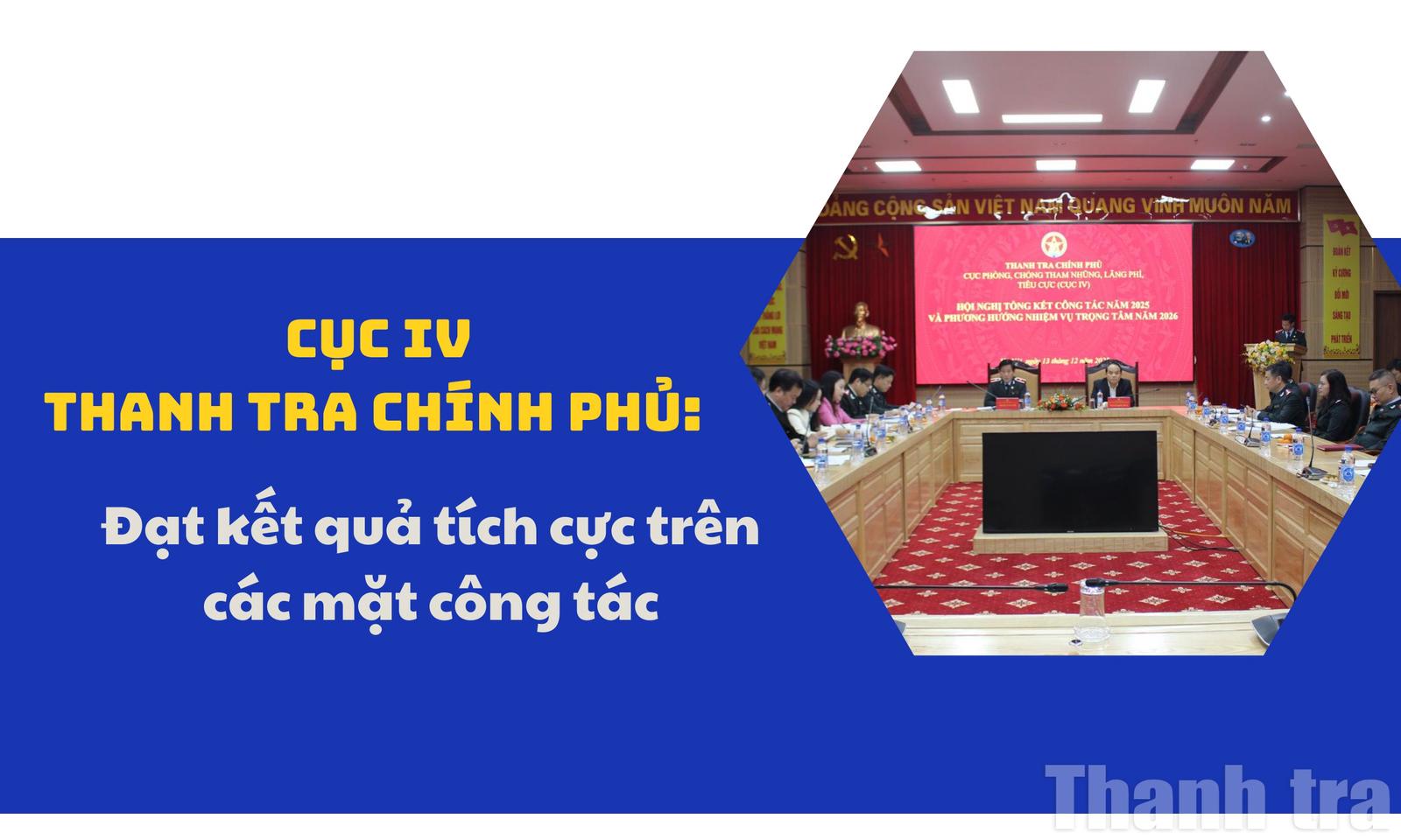 Báo cáo kết quả công tác năm 2025 của Cục IV cho thấy, công tác lãnh đạo, chỉ đạo, điều hành của Cục tiếp tục có những chuyển biến tích cực trên các mặt công tác, đạt nhiều kết quả trong thực hiện nhiệm vụ chính trị, cơ bản đáp ứng được yêu cầu của lãnh đạo Thanh tra Chính phủ. Đồng thời, công tác quản lý nhà nước về phòng, chống tham nhũng, lãng phí, tiêu cực được tăng cường, từng bước đi vào chiều sâu, có nhiều tiến bộ trong công tác tham mưu, tổng hợp, xây dựng thể chế.