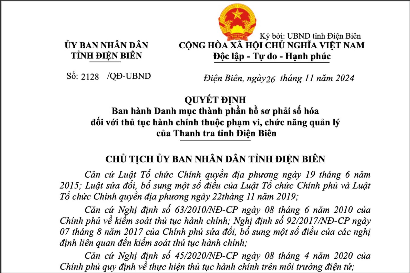 Tại Quyết định số 2128/QĐ-UBND, ngày 26/11/2024 của UBND tỉnh Điện Biên, ban hành danh mục thủ tục hành chính thuộc thẩm quyền giải quyết của Thanh tra tỉnh phải số hoá. Cụ thể: