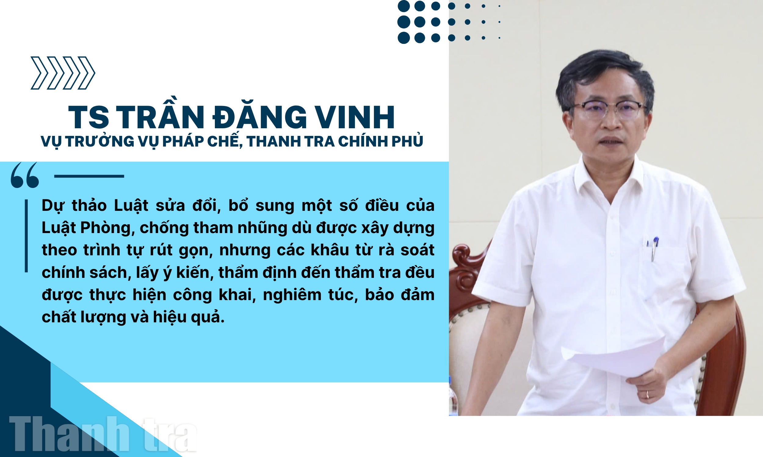 - TS Trần Đăng Vinh: Tinh thần đổi mới thể hiện xuyên suốt từ tư duy tiếp cận đến nội dung và quy trình xây dựng pháp luật. Dự thảo chuyển trọng tâm từ “kê khai hình thức” sang “kiểm soát thực chất”, coi kiểm soát quyền lực là then chốt, công khai, minh bạch là trọng tâm, công nghệ và dữ liệu là công cụ.