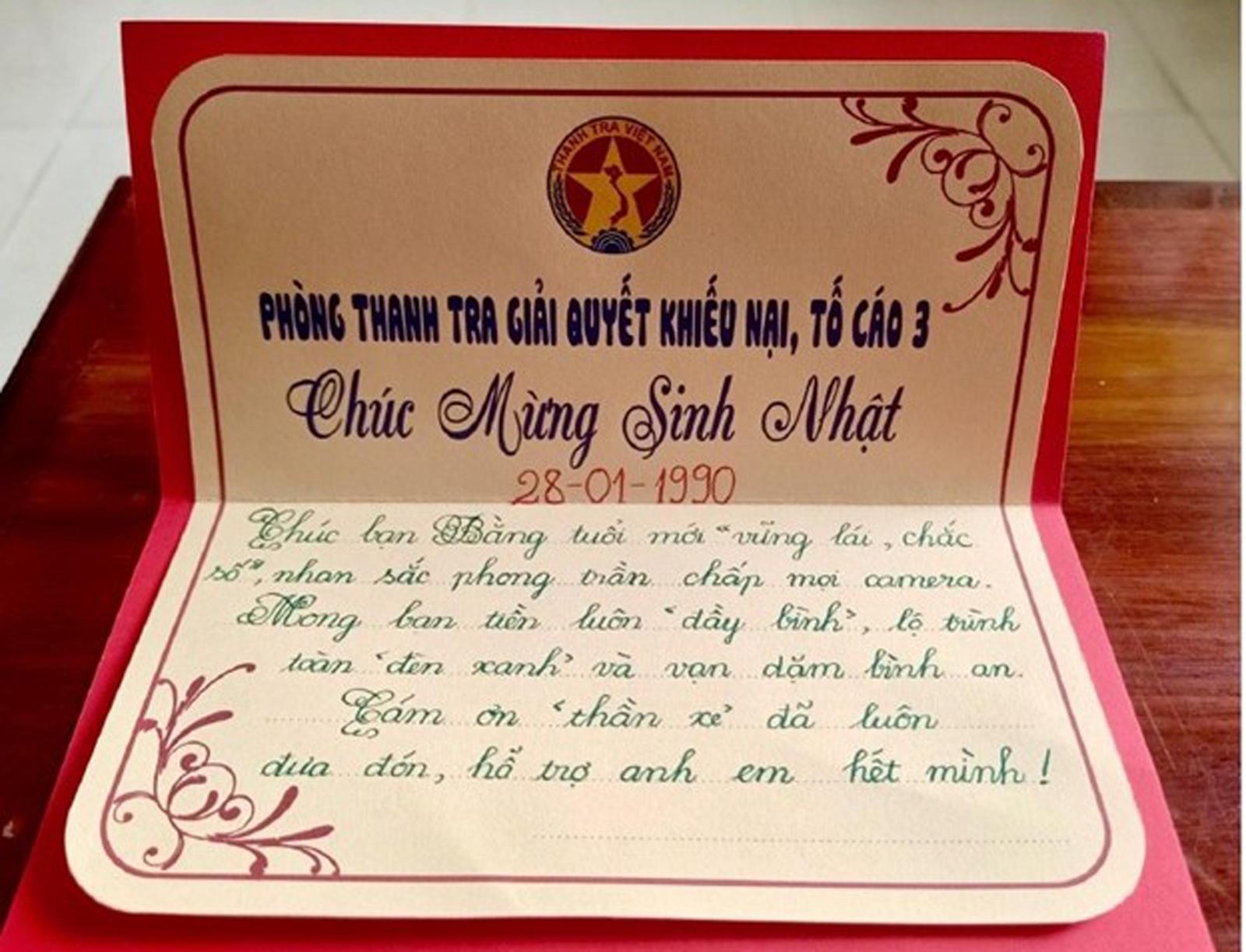 Điểm nhấn đầy xúc động và mang đậm dấu ấn riêng của Phòng Thanh tra, giải quyết khiếu nại, tố cáo 3 chính là những tấm thiệp chúc mừng sinh nhật do chính tay các công chức trong phòng tự thực hiện. Trong thời đại kỹ thuật số, khi những tin nhắn chúc mừng có thể được gửi đi chỉ bằng một thao tác sao chép - dán, thì việc tự tay cắt dán, nắn nót từng dòng chữ trên những tấm thiệp không đặt mua sẵn, không in theo mẫu là một hành động đáng quý. Từng tấm thiệp là một lời nhắn nhủ, là tình cảm chân thành mà đồng nghiệp dành cho nhau, những người hằng ngày cùng nhau nghiên cứu quy định, xử lý hồ sơ và tham mưu giải quyết các vụ việc bảo đảm tính khách quan.